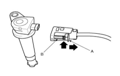 When removing the ignition coil connector, pull the lock pin(A) and push the clip(B).