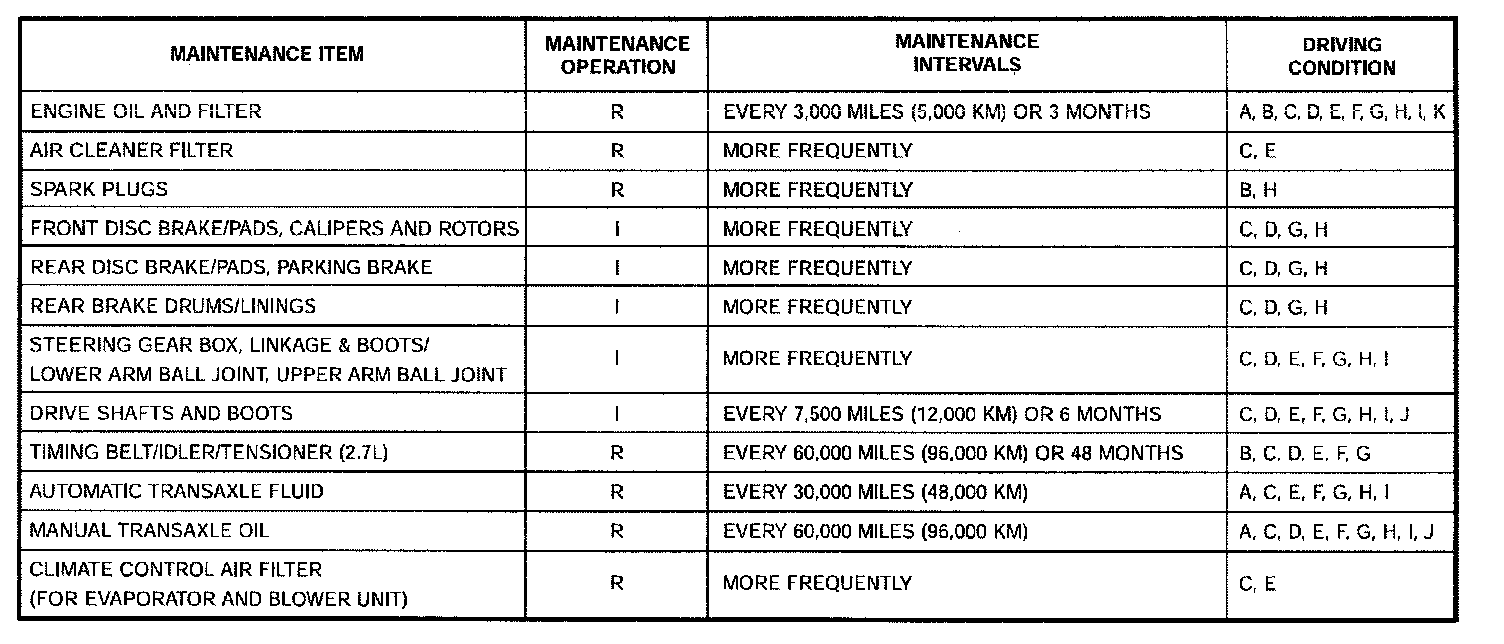 R: Replace. I: Inspect and, after inspection, clean, adjust, repair or replace if necessary.
