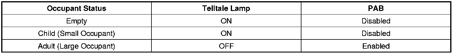 The Telltale Lamp indicates the Passenger Airbag(PAB) enabled and disabled status based on occupant status of passenger seat. If the passenger seat is empty or occupied with child (or child seat), the Passenger Airbag is disabled and the Telltale Lamp is turned ON to inform the driver that the PAB is disabled. As soon as operating voltage is applied to the SRSCM ignition input, the SRSCM activates telltale lamp prove out. OCS will send an defect status to the SRSCM as a default setting for passenger airbag deployment during the prove out period. Occupant status information and telltale status are as indicated below table.