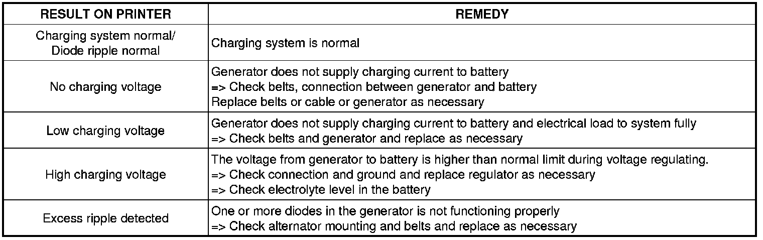 6. Take a relevant action according to the test results by referring to the table below after shutting off the engine and disconnect the tester clamps from the battery.