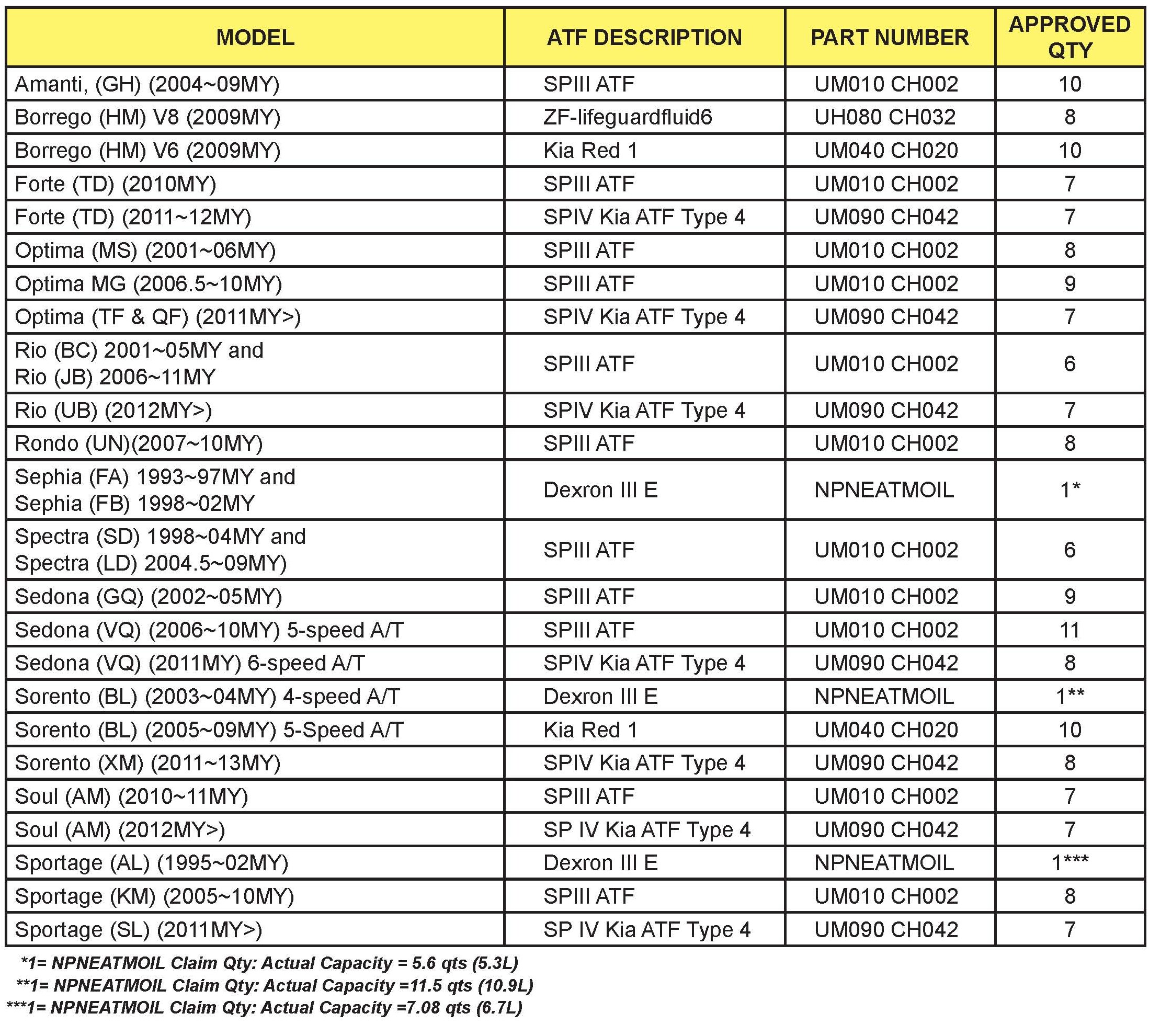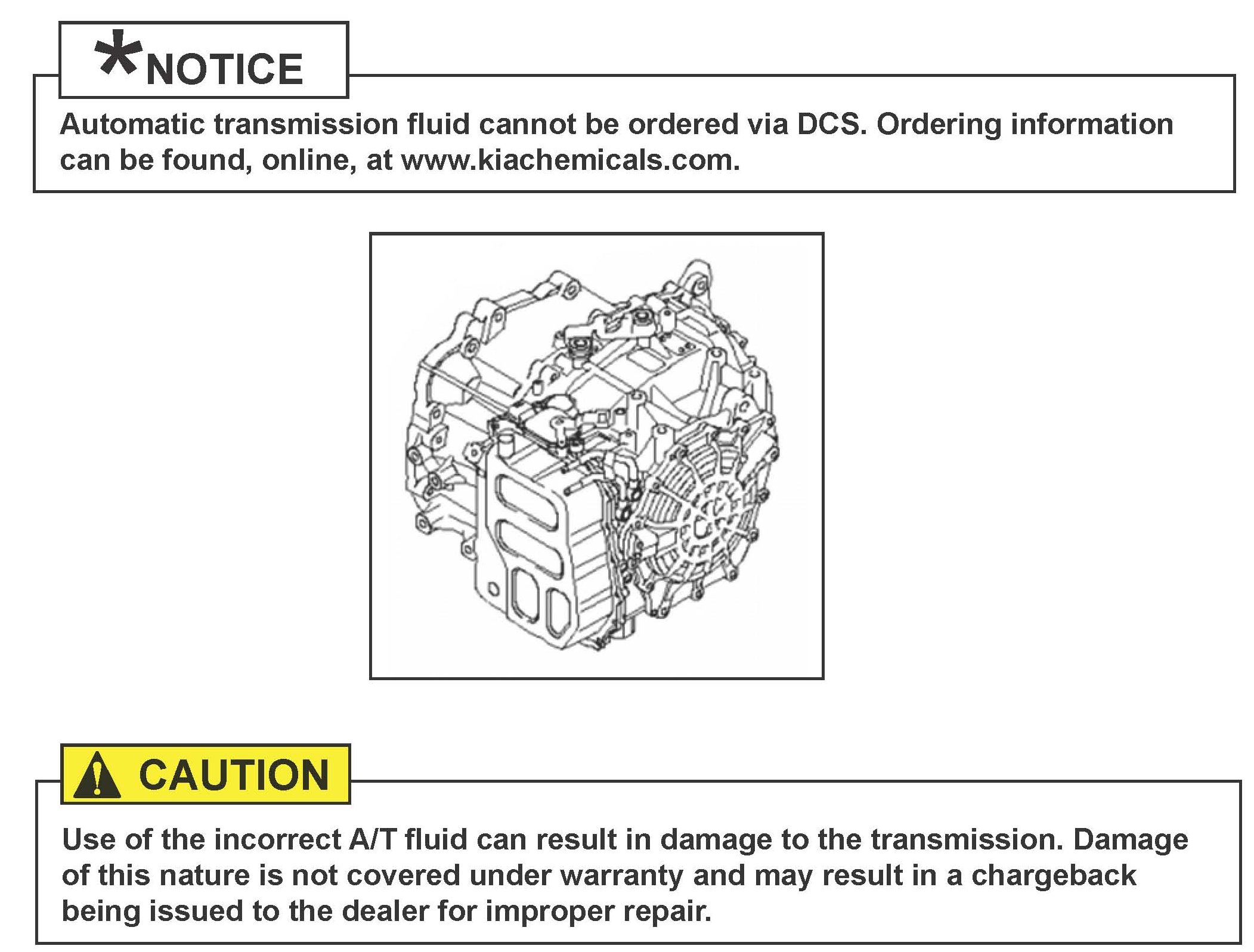 This bulletin provides information relating to the correct automatic transmission fluids that are required for each Kia model Refer to the shop manual on KGIS for the specific Kia model then reference the Automatic Transaxle System / Repair Procedures / Inspection and Adjustment section for the correct ATF check/fill procedures