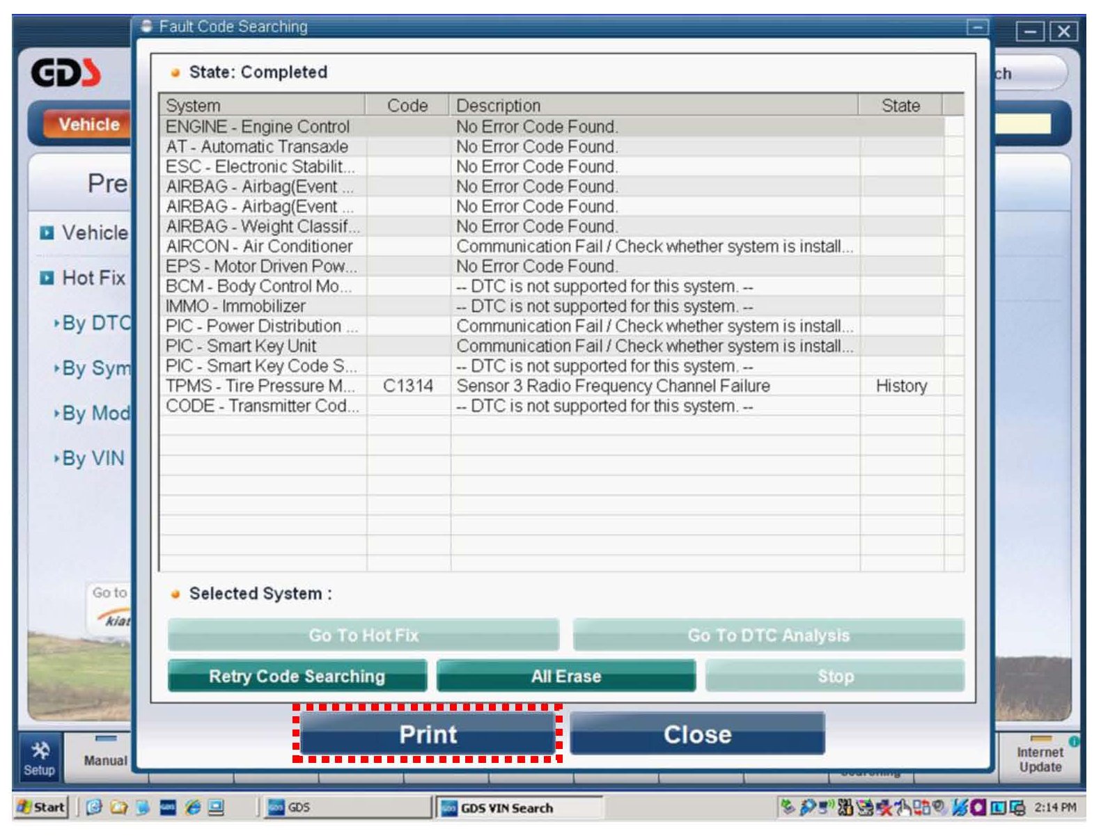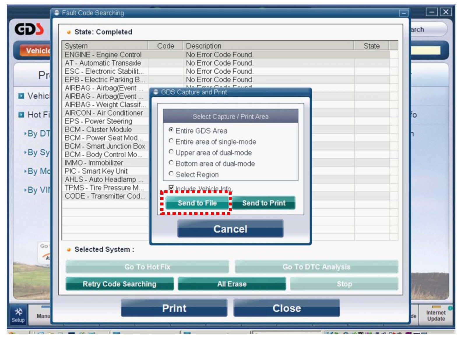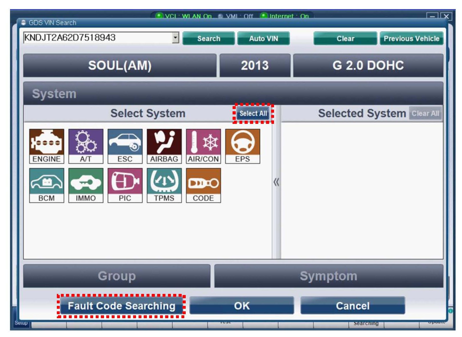 Beginning with the latest GDS software update, a new feature exists that facilitates the scanning of DTCs in all systems. This new feature is accessed via the "Select All" button and can be found in the GDS VIN Search screen. Follow the procedure below for detailed instructions.
