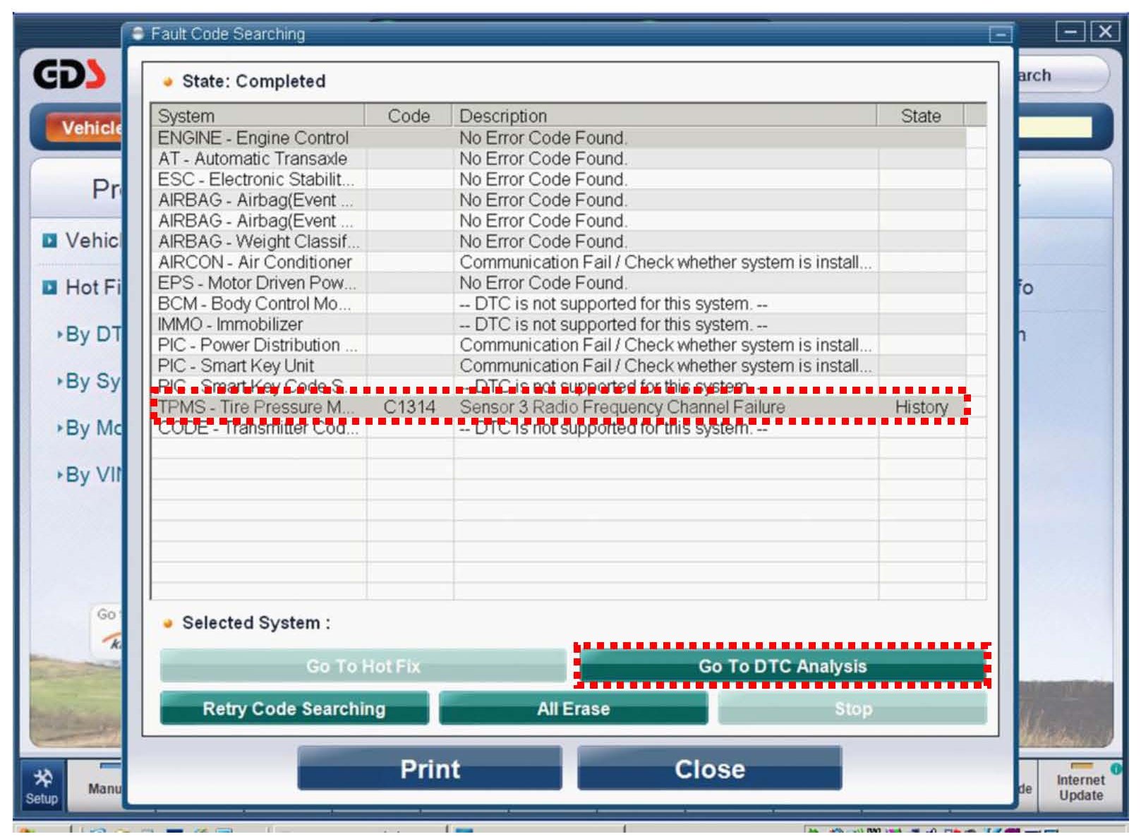 1. Click on the "Select All" button, and then click on the "Fault Code Searching" button.
