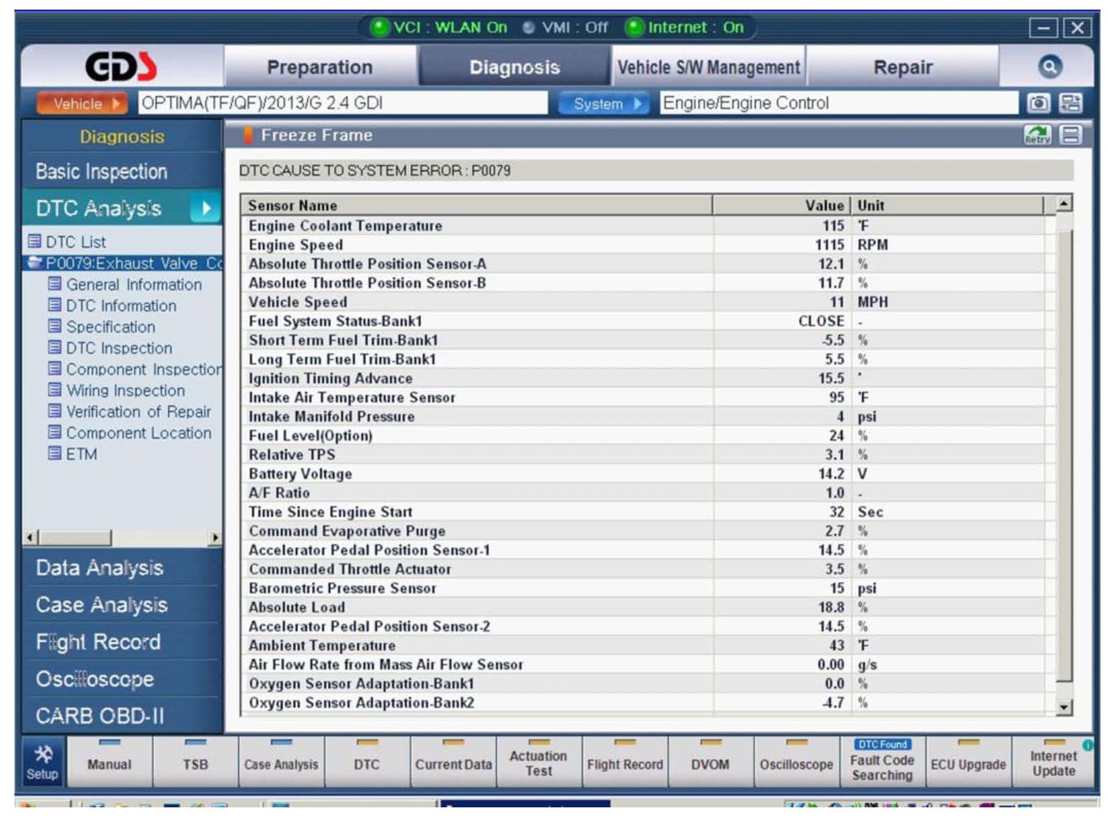 5. Also, it is good practice to always check Freeze Frame Data for all DTCs. Go to the system (e.g. Engine, A/T) where the DTC was recorded, click on Current Data > DTC > Freeze Frame to view the details. Save and print a screen capture(s) of these, if available.