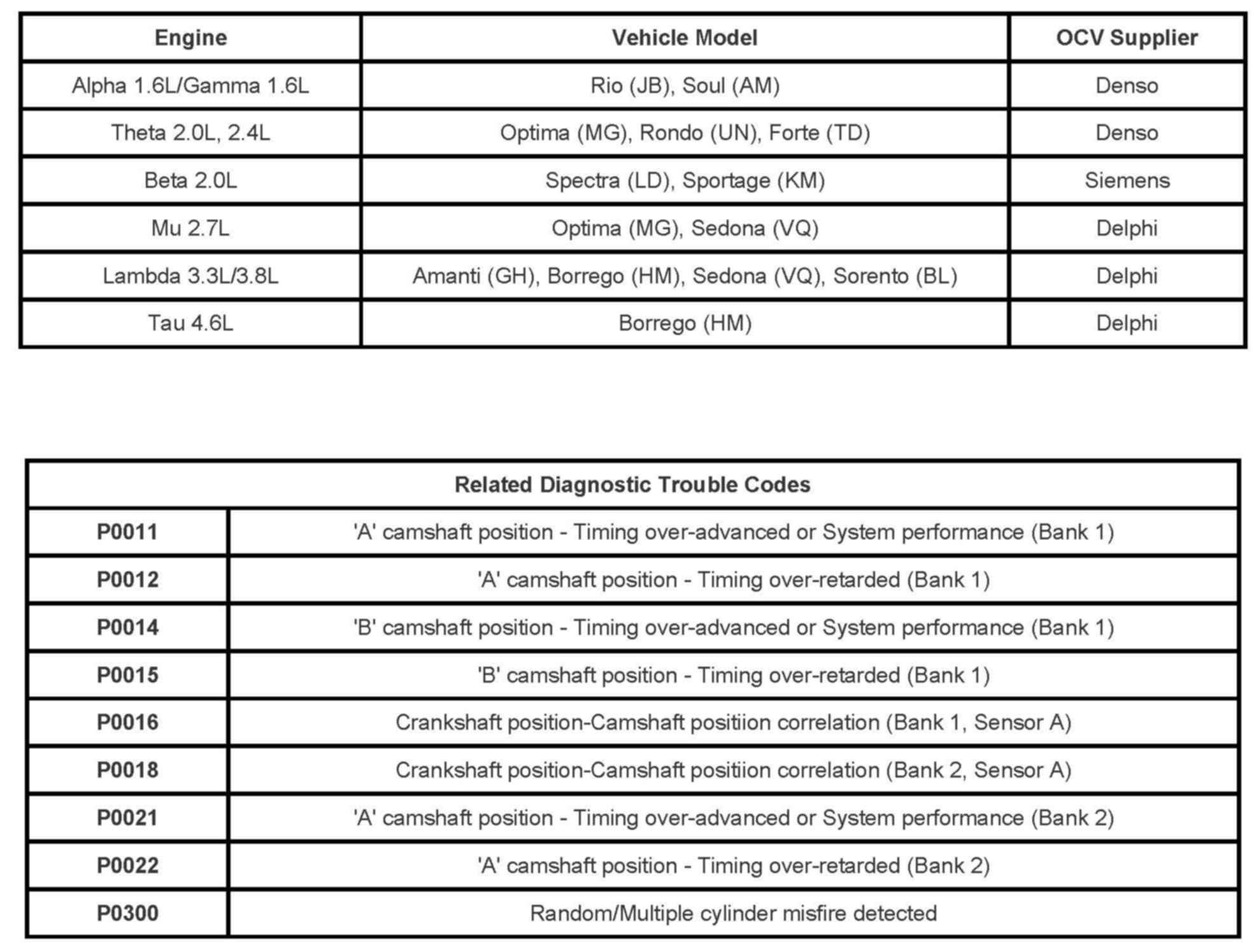 This bulletin provides information related to the Oil Control Valve (OCV) used in Constant Variable Valve Timing (CVVT). If at any time the OCV is suspected as a cause of rough idling, poor acceleration, camshaft timing misalignment-related trouble codes, misfire-related trouble codes, etc., on a Kia vehicle equipped with Continuously Variable Valve Timing (CVVT) system, be sure to perform the OCV inspection procedure below before replacement.