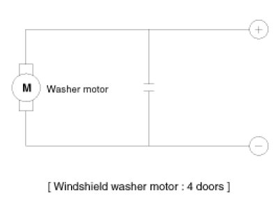 2. Connect positive (+) and negative (-) battery cables to terminals 1 and 2 respectively to see that the washer motor runs and water sprays from the front nozzles.
