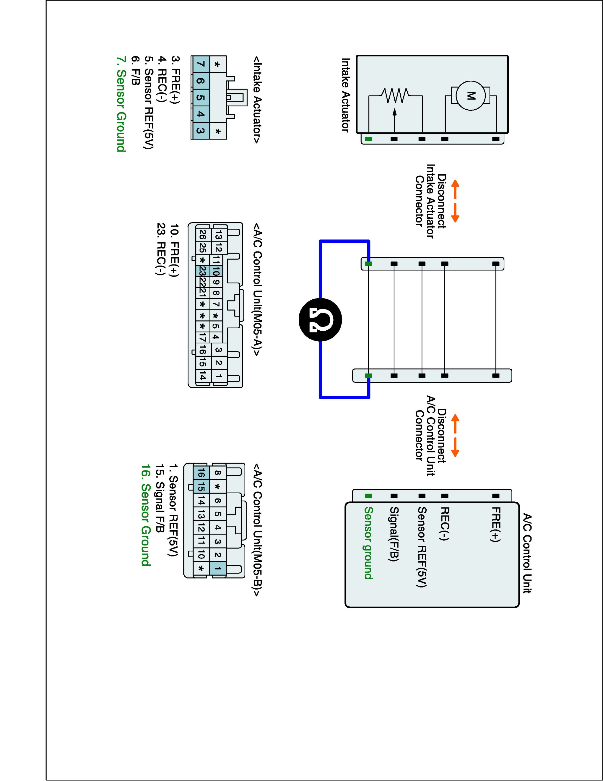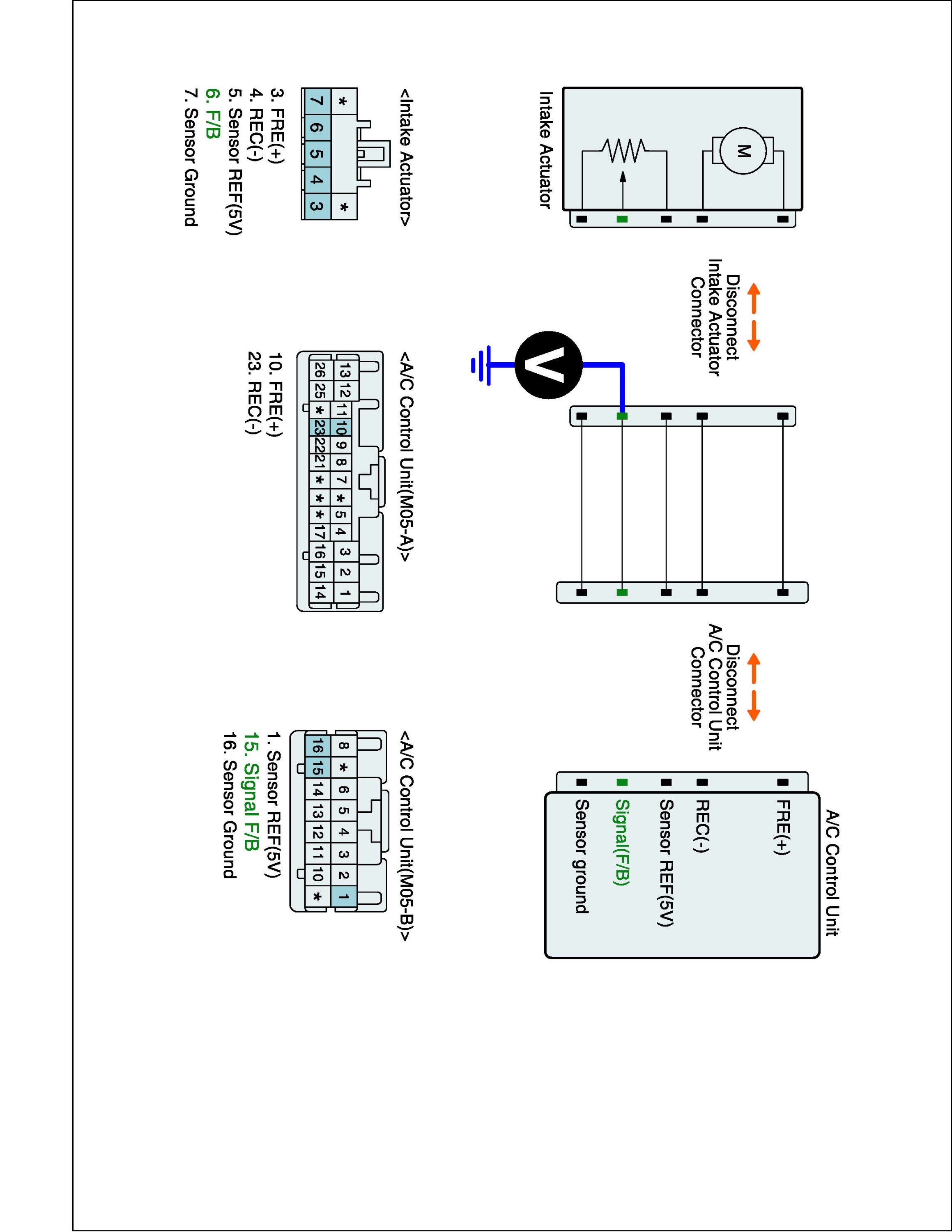 3. Measure resistance between Sensor ground (-) terminal of Intake actuator harness connector and Sensor ground (-) terminal of A/C-ECU harness connector.