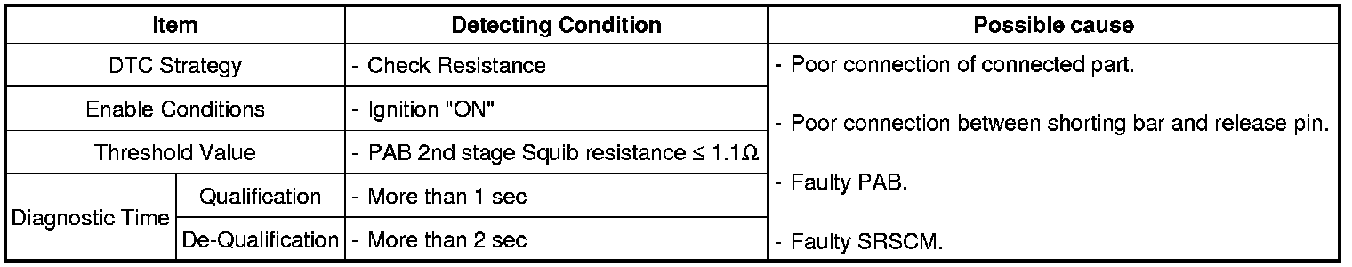 The SRSCM sets DTC B1486 if the measured resistance value of PAB circuit is less than the threshold value.
