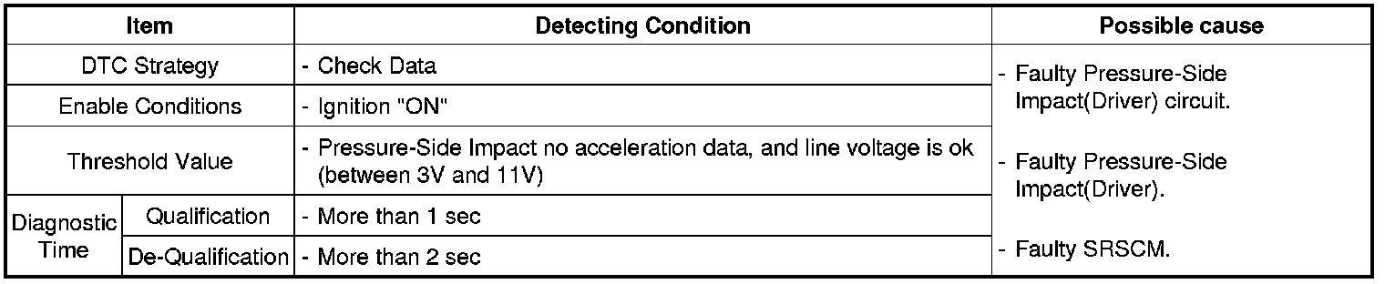 The SCM detects the impact signals of the Pressure-Side Impact Sensor and Side Impact Sensor and compares with signals of the safe sensor inside. If the signals of all sensors are judged as a collision, the side-airbag and the curtain-airbag would be unfolded.