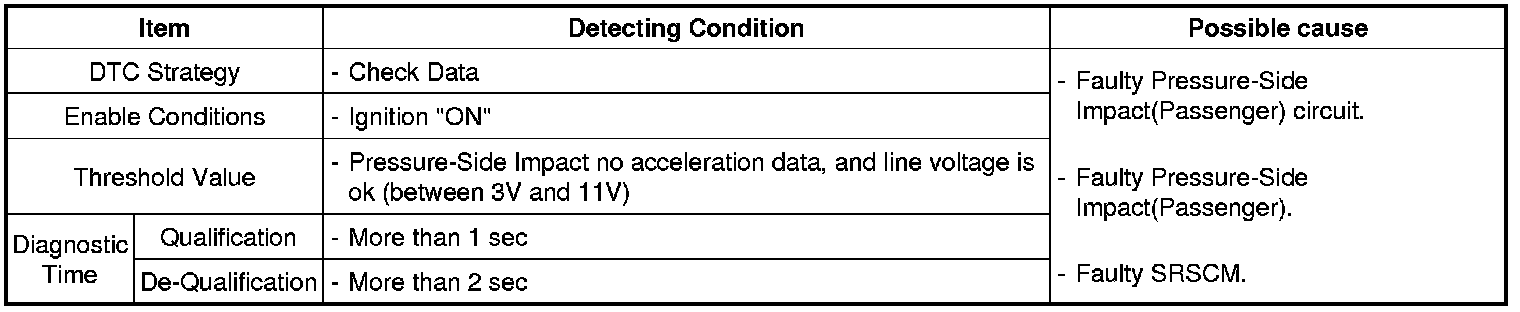 The SCM detects the impact signals of the Pressure-Side Impact Sensor and Side Impact Sensor and compares with signals of the safe sensor inside. If the signals of all sensors are judged as a collision, the side-airbag and the curtain-airbag would be unfolded.