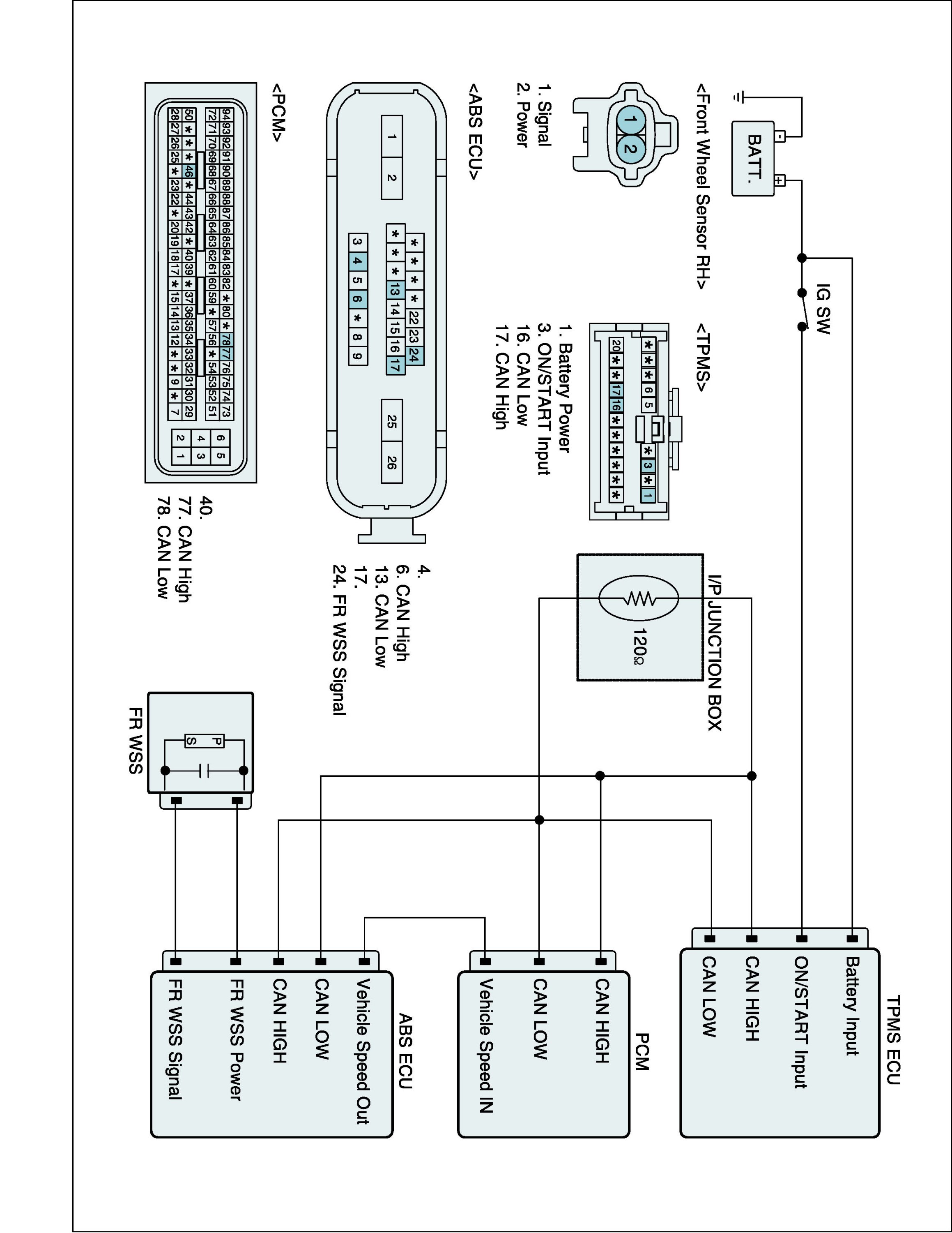 Various TPMS functions rely on a speed signal that reports reliably actual vehicle speed. Three speed signals (ABS1 FR wheel, EMS1 speed signal, TCS5 FR wheel) compared since one signal alone may report incorrect vehicle speed which would go undetected. Three signals must report same vehicle speed. If not, a DTC shall be set to active, and TPMS Warning indicator shall turn on.