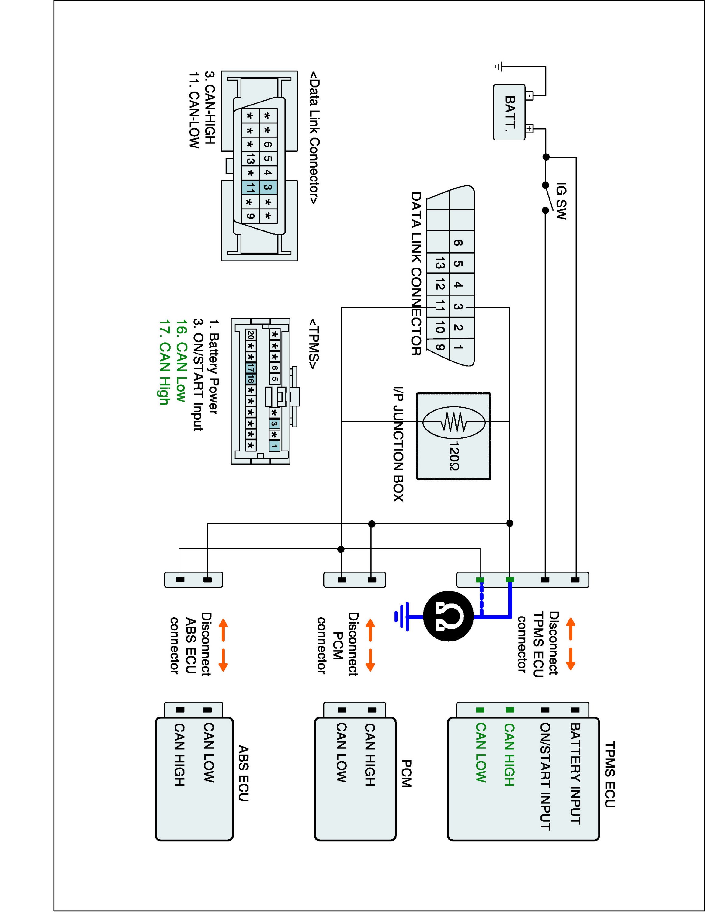 3. Measure resistance between CAN LOW terminal, CAN HIGH terminal of the TPMS ECU harness connector and chassis ground.