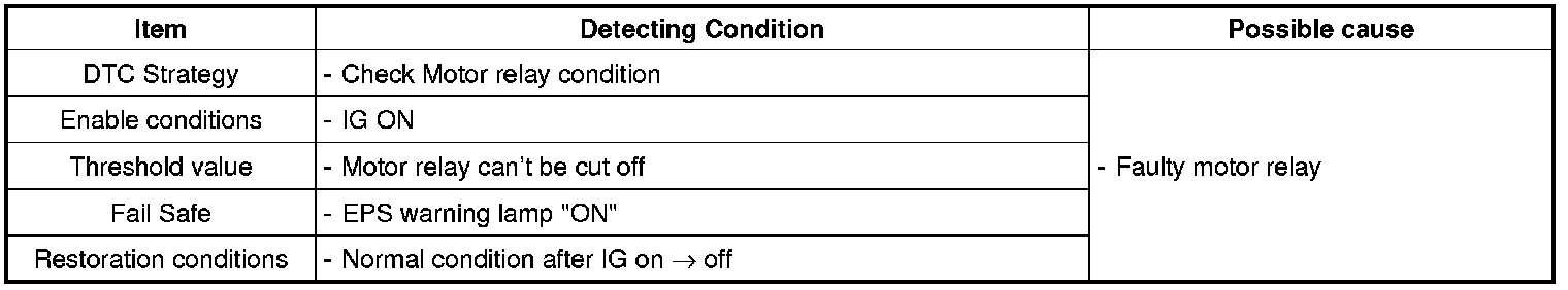 EPS CM checks a motor relay condition by testing. EPS CM sets this code and turns on warning lamp if a motor relay can't be cut off in abnormal condition.