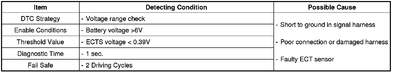 PCM sets DTC P0117 if the PCM detects signal voltage lower than the possible range of a properly operating ECTS.