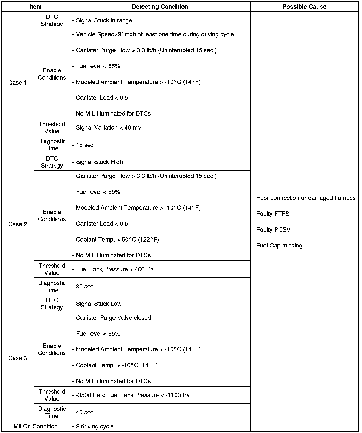 The PCM monitors pressure in the fuel tank by means of Fuel Tank Pressure Sensor (FTPS) during purge control valve opening or closing phase. This monitoring will determine if pressure sensor signal is stuck. The PCM sets DTC P0451 if pressure variation is smaller than the predetermined threshold.
