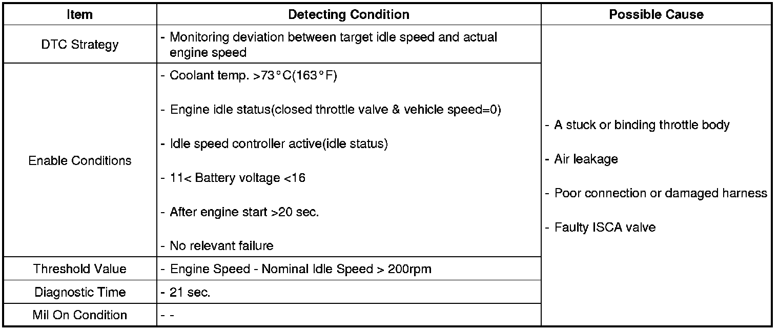 The PCM monitors engine speed deviation from the target idle engine speed when the vehicle is stopped and the throttle valve opening is stable. The PCM sets DTC P0507 if the difference to the target idle engine speed is higher than the predetermined threshold.
