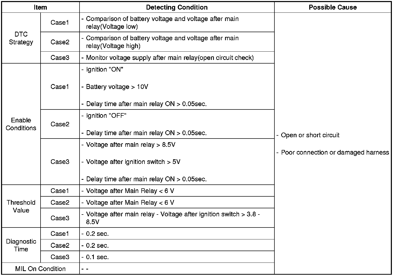 The PCM measures the voltage from ignition key and from main relay respectively and compares two voltages. This comparison will watch if the Main Relay has switched and remains on after ignition Key-On and if it has switched off after the ignition Key-Off. The PCM sets DTC P0560 if the voltage after Main Relay is lower than a predetermined threshold after ignition key-on or higher than a predetermined threshold after ignition key-off.