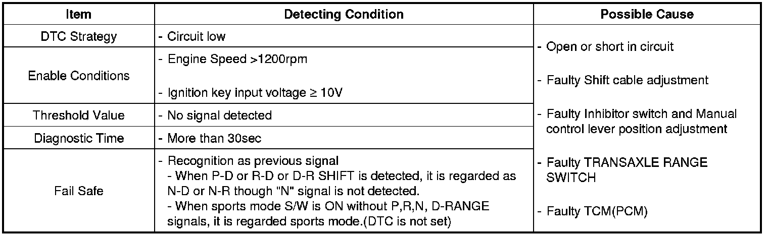 The Transaxle Range Switch sends the shift lever position information to the TCM (PCM) using a 12 V (battery voltage) signal. When the shift lever is in the D (Drive) position the output signal of Transaxle Range Switch is 12 V and in all other positions the voltage is 0 V. The TCM (PCM) judges the shift lever position by reading all signals, for the Transaxle Range Switch, simultaneously.