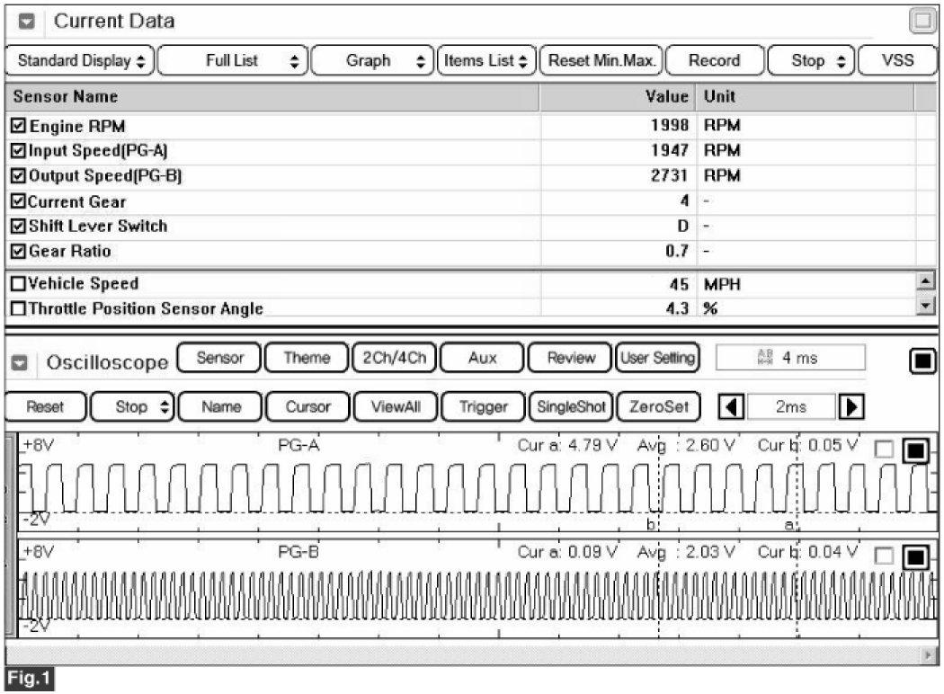 The value of the input shaft speed should be equal to the value of the output shaft speed, when multiplied by the 4th gear ratio, while the transaxle is engaged in the 4th gear. For example, if the output speed is 1,000 rpm and the 4th gear ratio is 0.712, then the input speed is 712 rpm.
