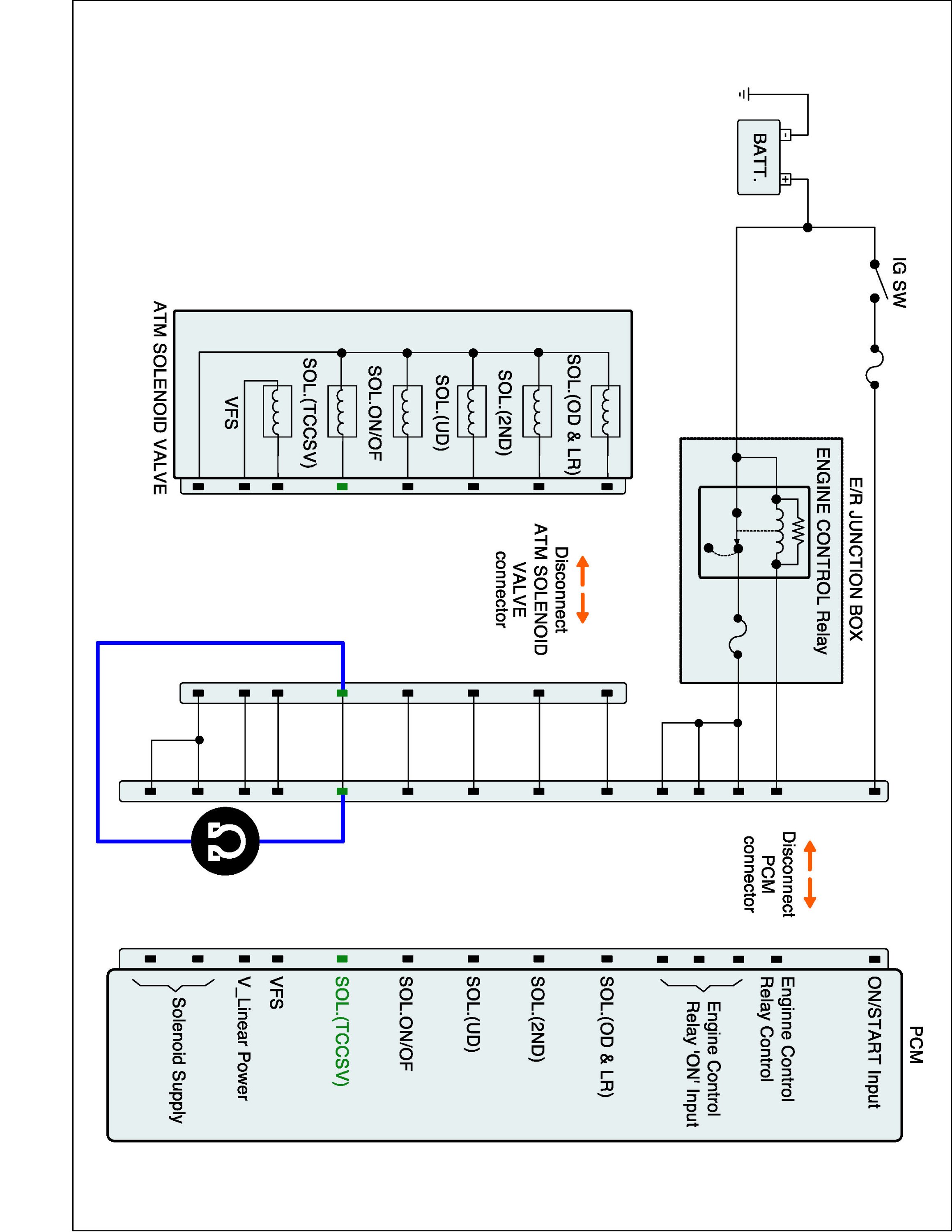 2. Disconnect "A/T SOLENOID VALVE" connector and "PCM/TCM" connector.