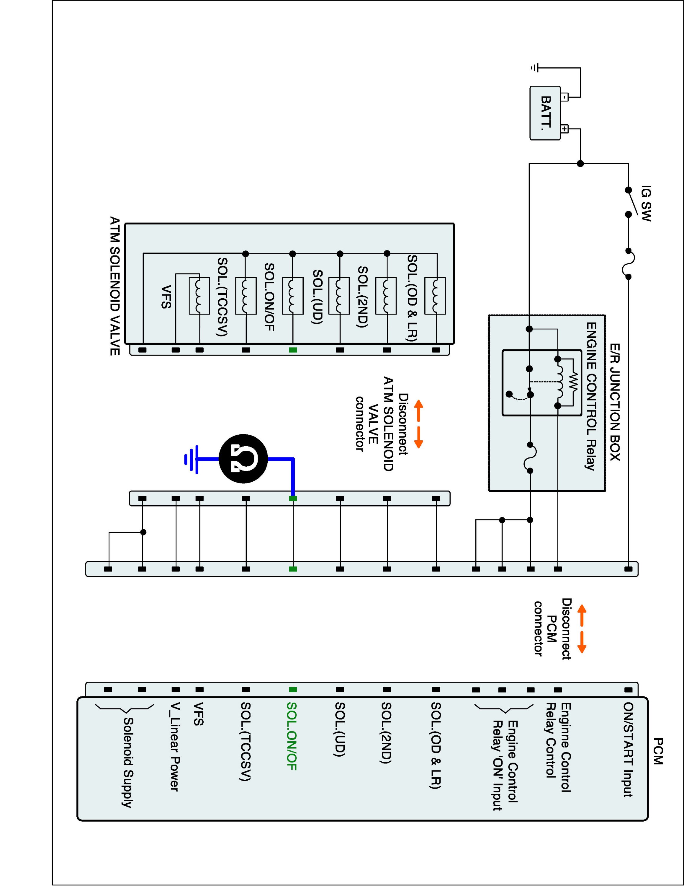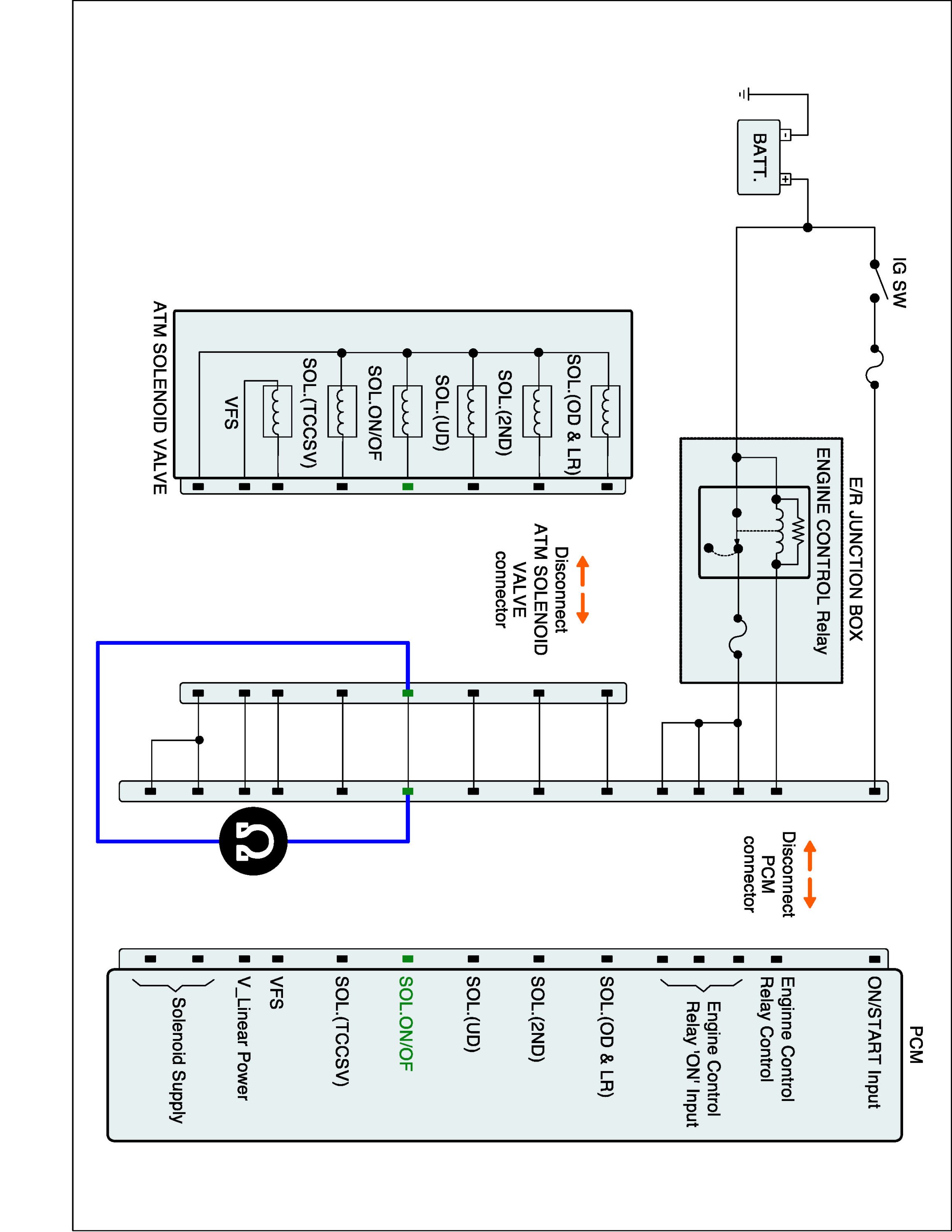 2. Disconnect "A/T SOLENOID VALVE" connector and "PCM/TCM" connector.