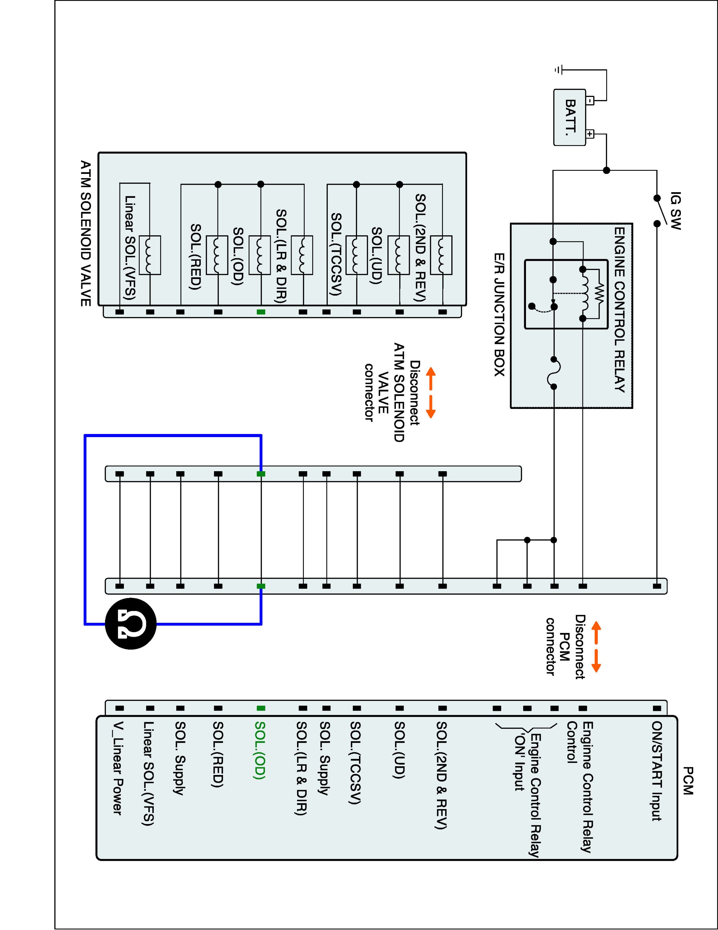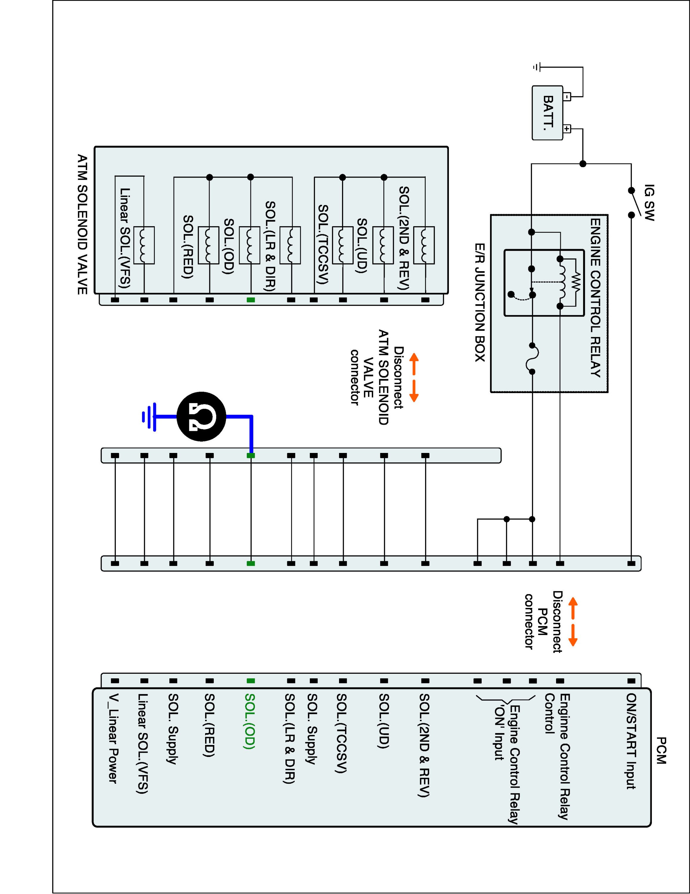 2. Disconnect "A/T SOLENOID VALVE" connector and "PCM/TCM" connector.