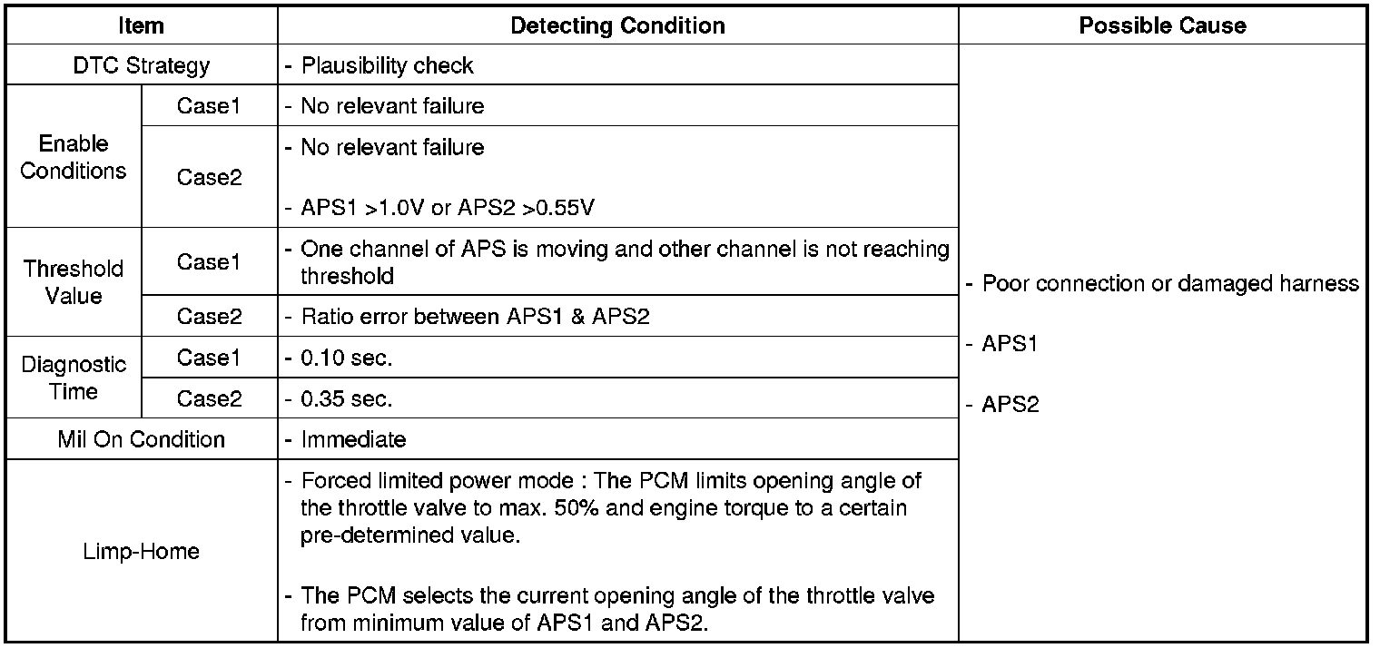 PCM sets DTC P2138 if the PCM detects output voltage of the APS 1 is not proportion to APS 2.