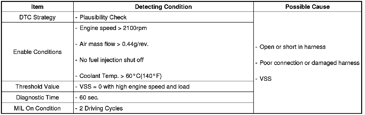 The PCM evaluates engine speed and mass air flow if there is no vehicle speed signal. This evaluation of both values will detect open circuit or short circuit errors on the wheel speed sensor. The PCM sets DTC P2159 if there is no vehicle speed signal from wheel speed sensor while both engine speed and mass air flow are higher than predetermined threshold during the predetermined time
