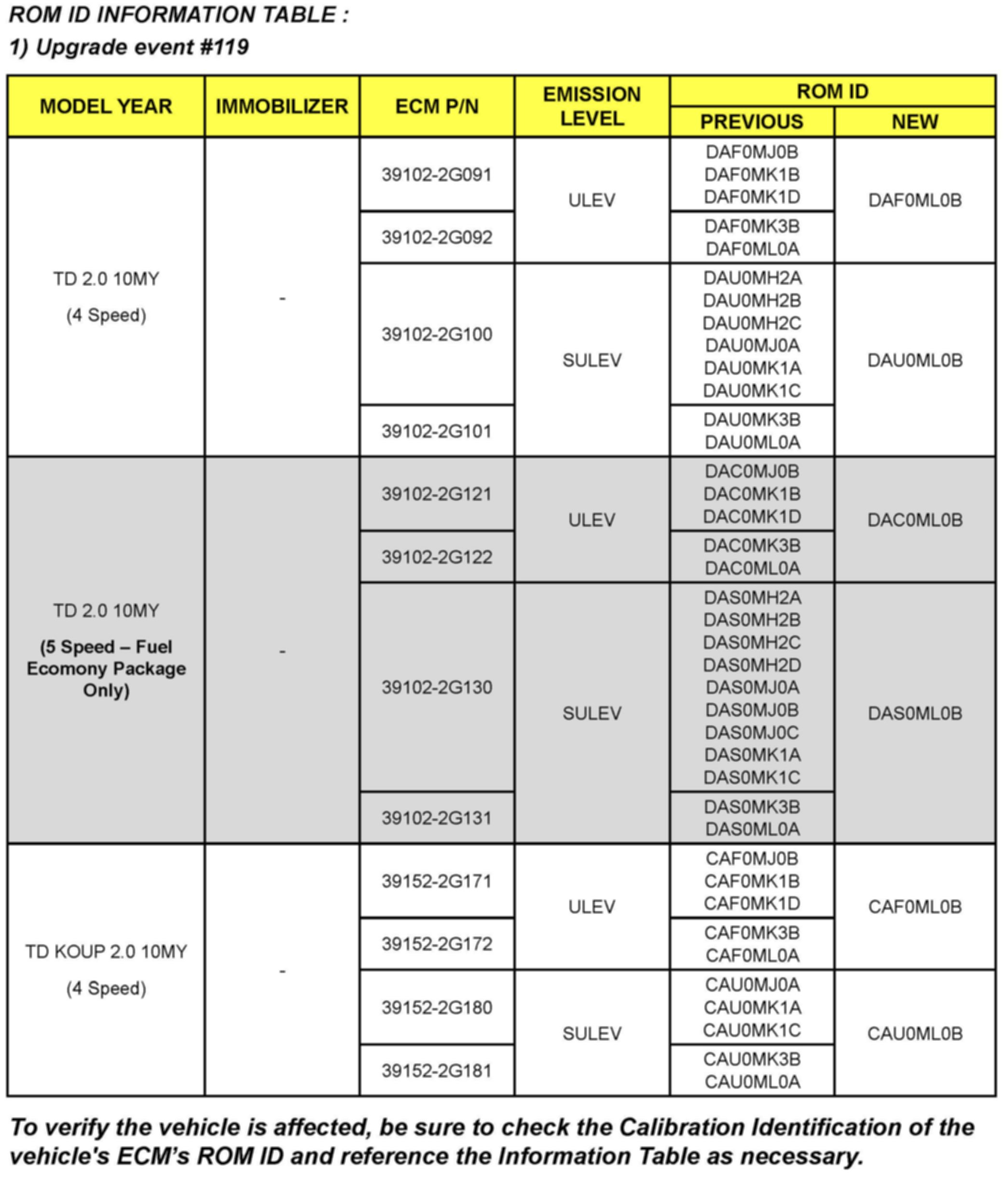 This bulletin provides the procedure to upgrade the Powertrain Control Module (PCM) of some 2010 Model Year Forte (TD) Sedan and Koup with 2.0L engines. This reflash has enhanced VCM logic to improve a rough idle condition at start-up or a MIL ON and stored DTC P0304 set at start-up. For confirmation that the latest reflash has been performed to a vehicle you are working on, verify ROM ID using the tables in this TSB.