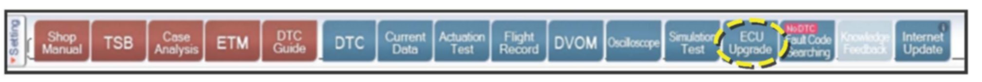 6. Once back at the GDS Main Screen, select ECM upgrade from the bottom right-hand corner. Next select Auto Mode, Engine. Perform the ECM upgrade in accordance with normal GDS tool ECM upgrade procedures.