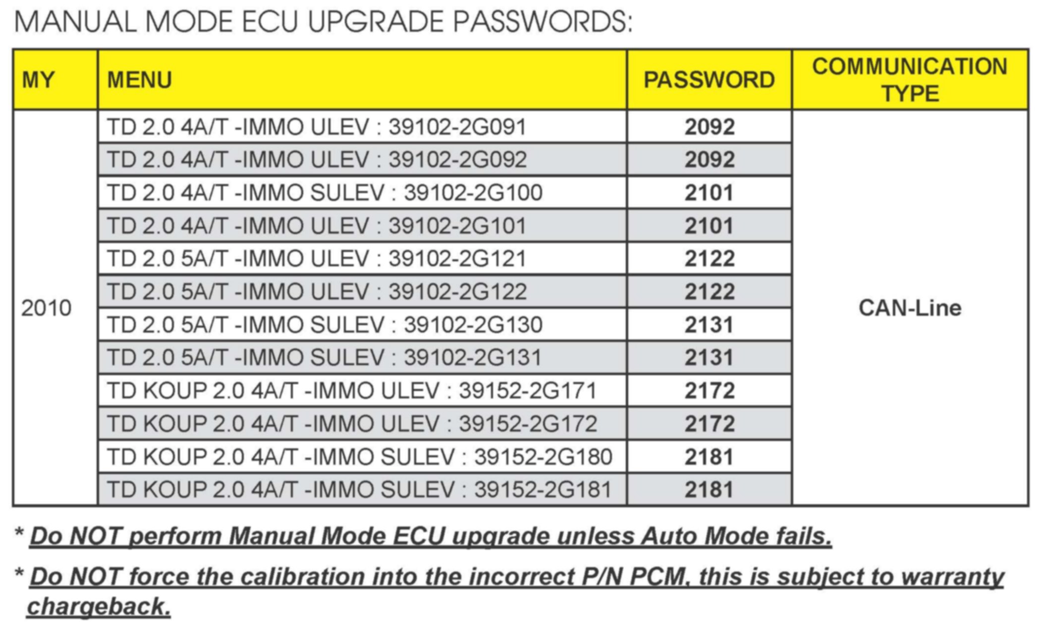 MANUAL MODE ECU UPGRADE PASSWORDS