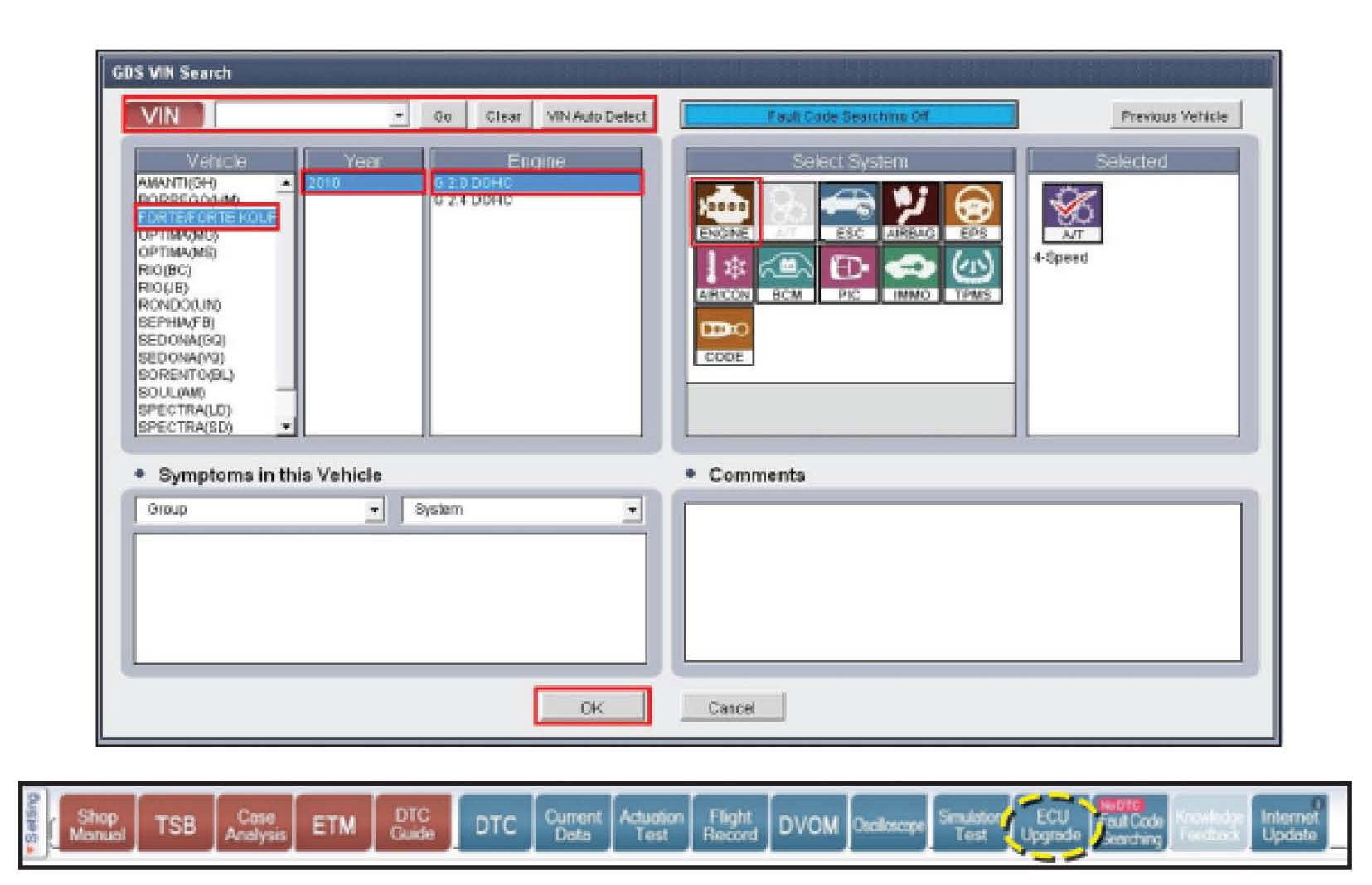 6. Once back at the GDS Main Screen, select ECM upgrade from the bottom right-hand corner. Next select Auto Mode, Engine.