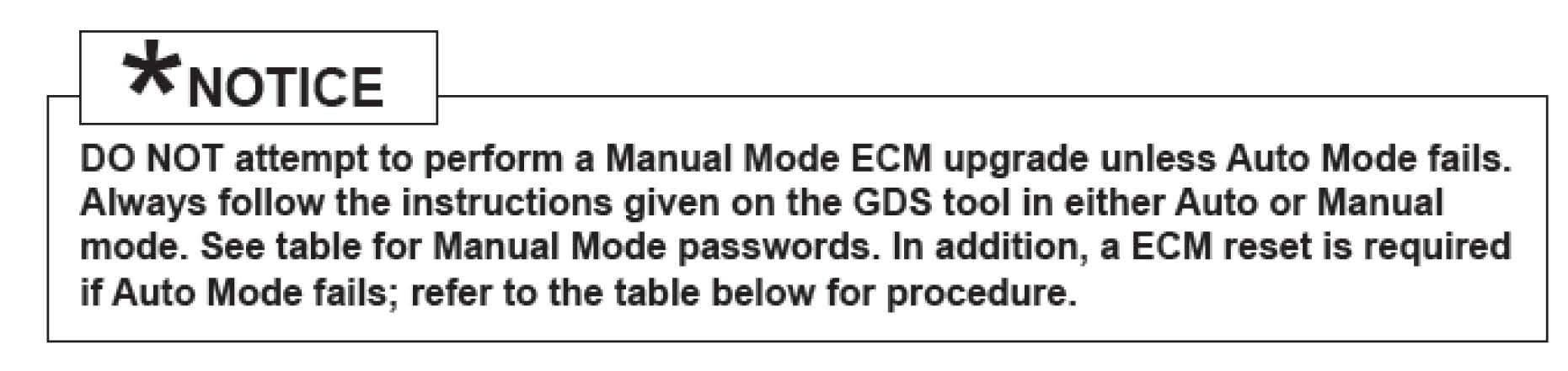 * Do NOT perform Manual Mode ECM upgrade unless Auto Mode fails.
