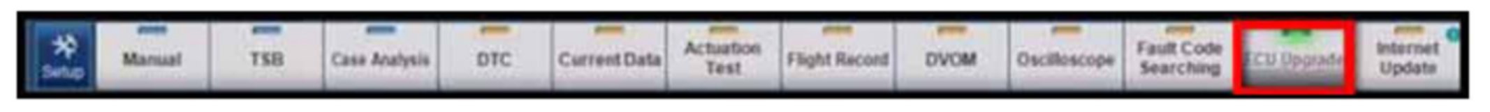 6. Once back at the GDS Main Screen select ECU Upgrade from the bottom right-hand corner. Next select Auto Mode and then Engine. Perform the ECM upgrade in accordance with normal GDS tool ECM upgrade procedures.