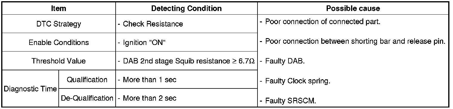 The SRSCM sets DTC B1481 if the measured resistance value of DAB circuit is more than the threshold value.