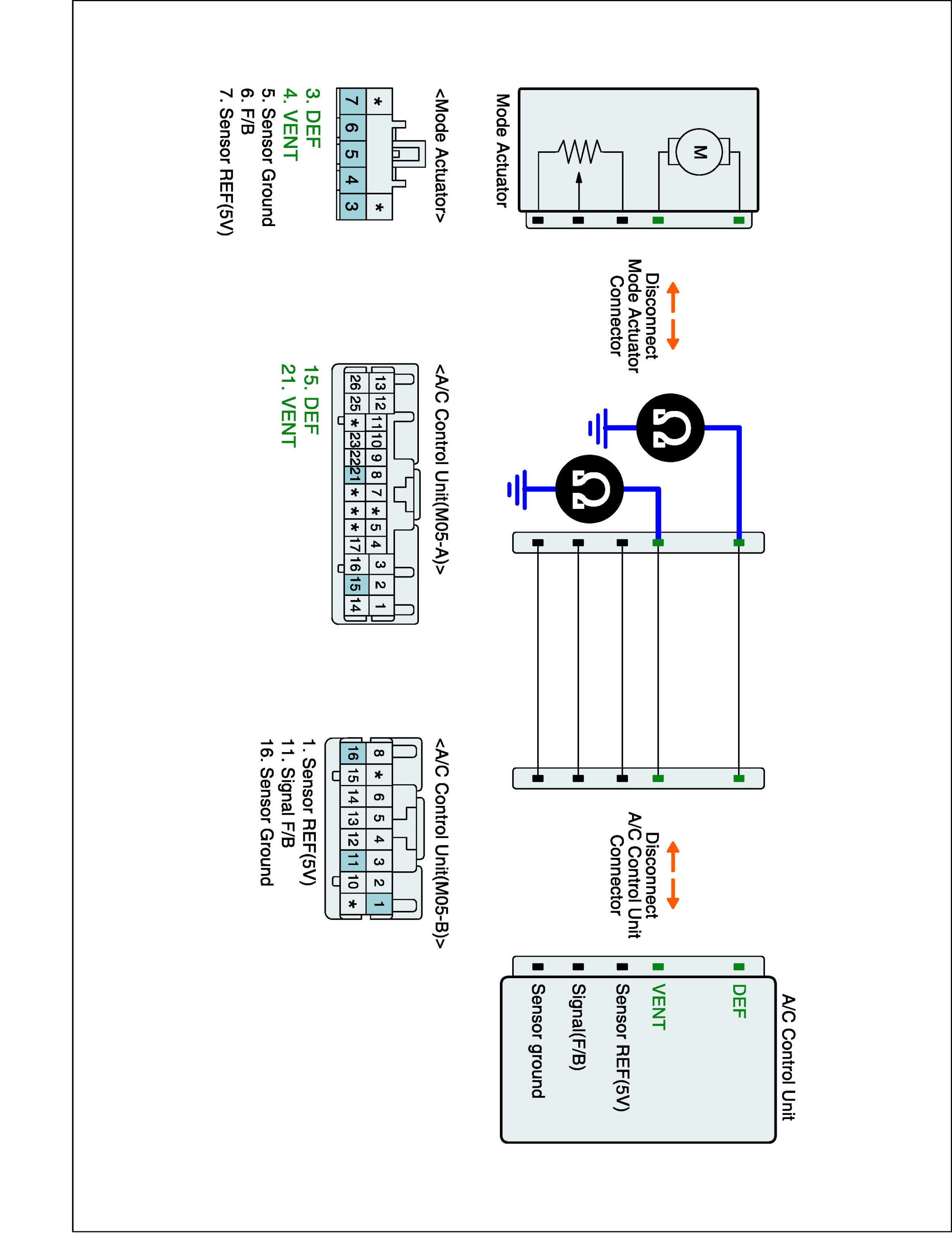 3. Measure resistance between DEF terminal of Driver Direction actuator harness connector and DEF terminal of A/C-ECU harness connector.