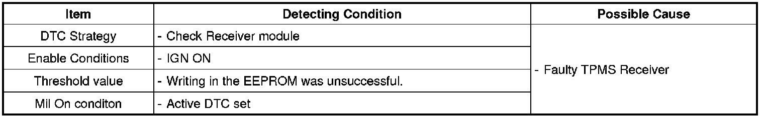 This DTC indicates that the receiver has a problem reading or writing to EEPROM. The most likely cause is TPMS Receiver failure.