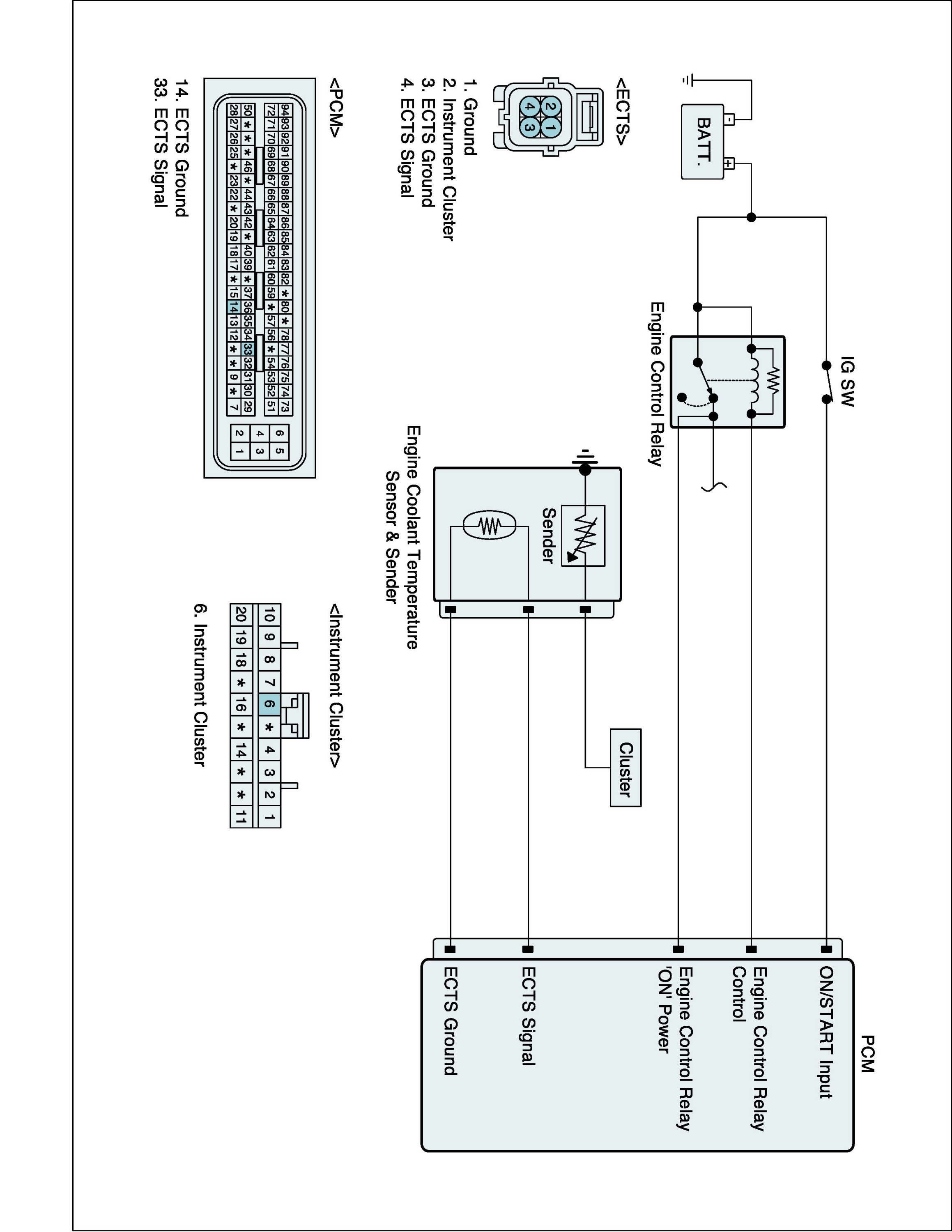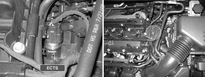 The Engine Coolant Temperature Sensor (ECTS) is located in the engine coolant passage of the cylinder head for detecting the engine coolant temperature. The ECTS uses a thermistor whose resistance changes with the temperature. The electrical resistance of the ECTS decreases as the temperature increases, and increases as the temperature decreases. The reference 5 V in the PCM is supplied to the ECTS via a resistor in the PCM. That is, the resistor in the PCM and the thermistor in the ECTS are connected in series. When the resistance value of the thermistor in the ECTS changes according to the engine coolant temperature, the output voltage also changes.During cold engine operation the PCM increases the fuel injection duration and controls the ignition timing using the information of engine coolant temperature to avoid engine stalling and improve drivability.