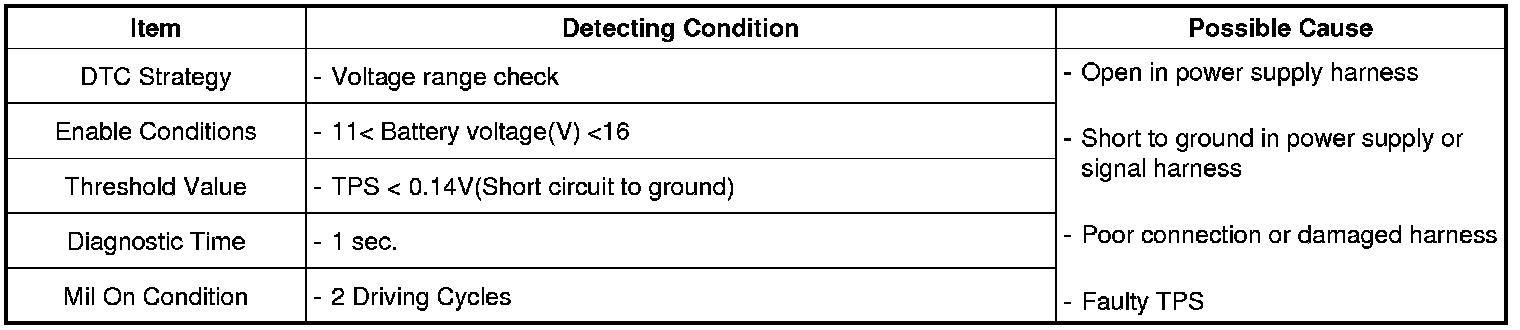 PCM sets DTC P0122 if the PCM detects signal voltage lower than the possible range of a properly operating TPS.