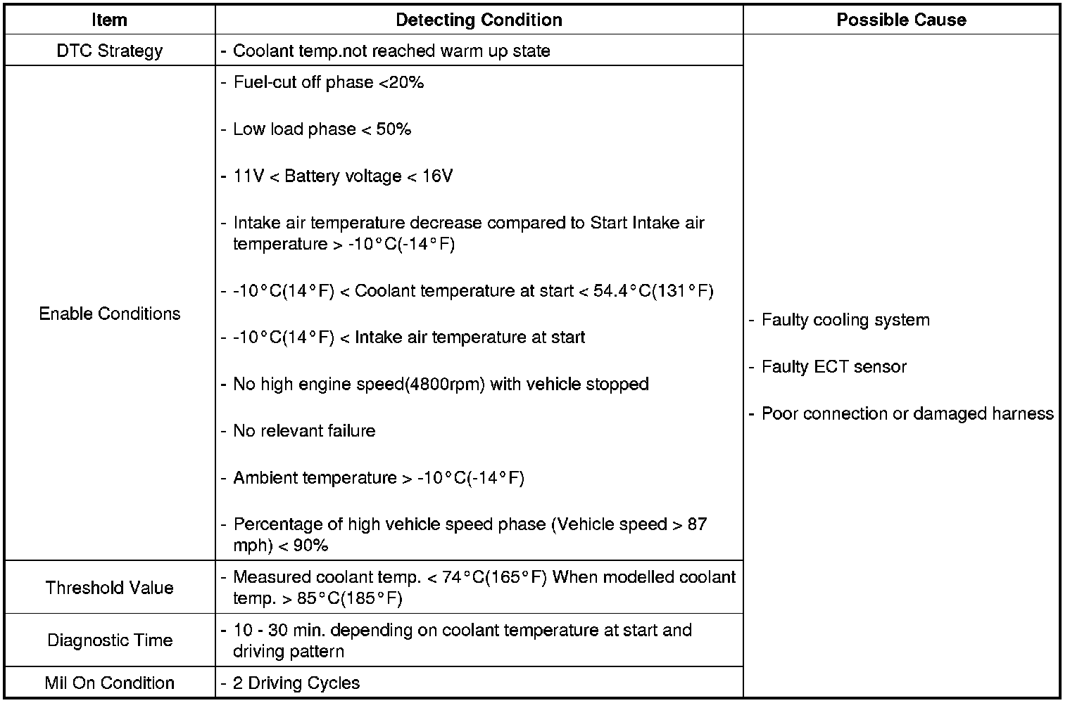 An open stuck thermostat means an increase of the engine warm up time and can cause emission increase as well. To detect open stuck thermostat, the ECM checks measured coolant temperature as soon as calculated coolant temperature reaches threshold and sets DTC P0128 when measured coolant temperature is lower than threshold. If same code is set again in the next driving cycle, MIL is illuminated.
