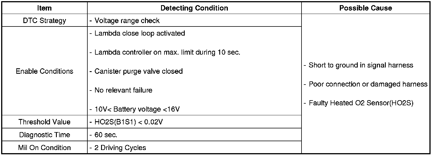PCM sets DTC P0131 if the HO2S (B1S1) voltage remains excessively low for a predetermined time.