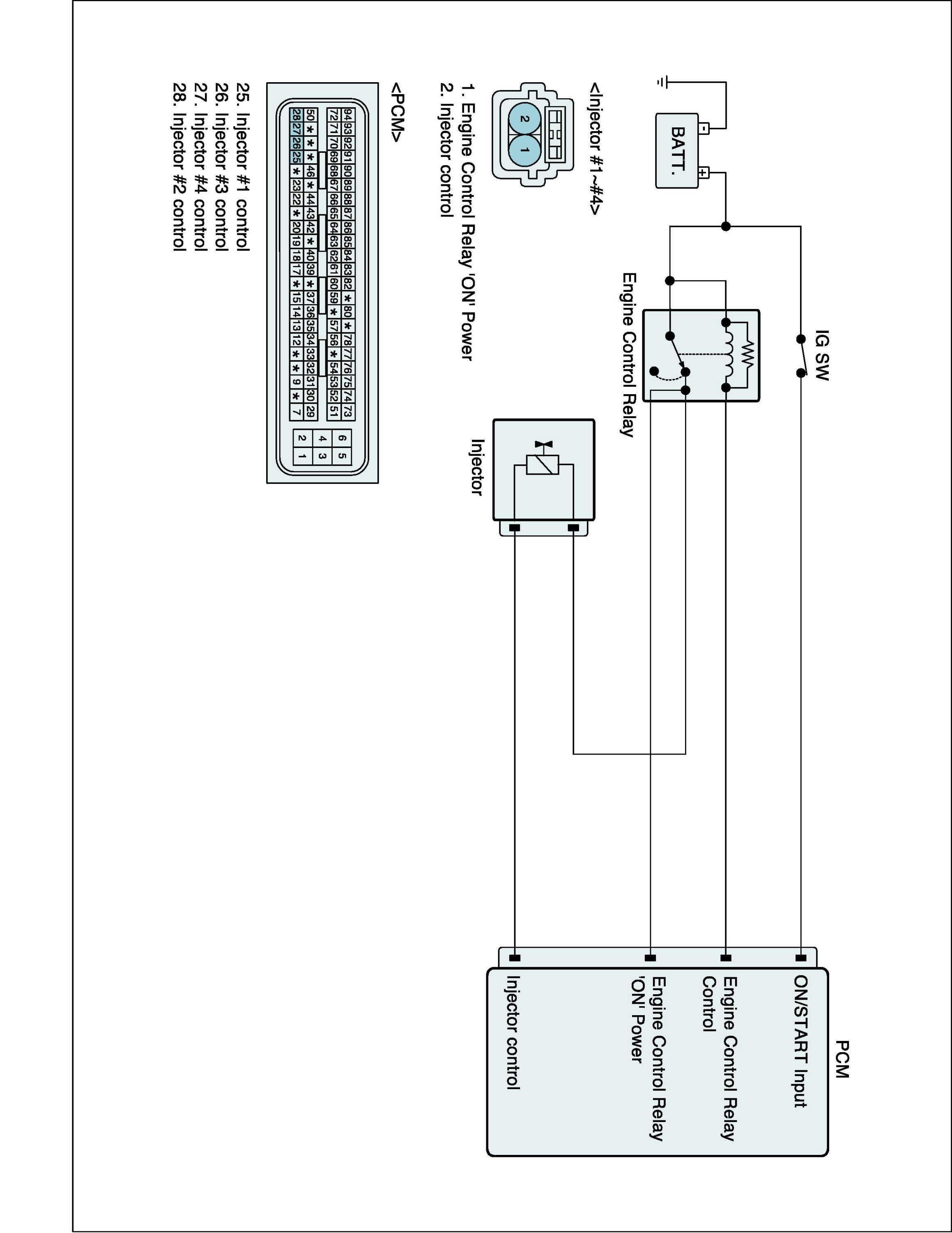 Based on information from various sensors, the PCM measures the fuel injection amount. The fuel injector is a solenoid-operated valve and the fuel injection amount is controlled by length of time the fuel injector is held open. The PCM controls each injector by grounding the control circuit. When the PCM energizes the injector by grounding the control circuit, the circuit voltage should be low (theoretically 0 V) and the fuel is injected. When the PCM de-energizes the injector by opening control circuit, the fuel injector is closed and circuit voltage should momentarily peak.