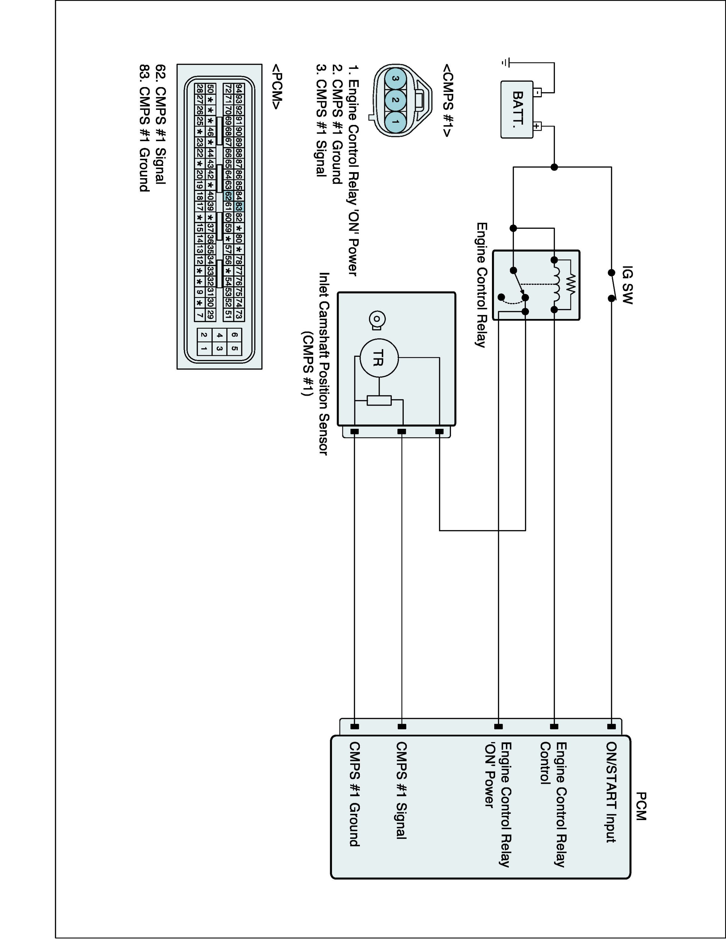 The Camshaft Position Sensor (CMPS) is a sensor that detects the compression TDC of the NO. 1 cylinder. The CMPS consists of a hall type sensor and a target on the end of the intake camshaft. When the target triggers the sensor, the sensor voltage is 5 V. If not, the sensor voltage is 0 V. These CMPS signal is sent to the PCM and the PCM uses the CMPS signal for synchronizing the firing of sequential fuel injectors.