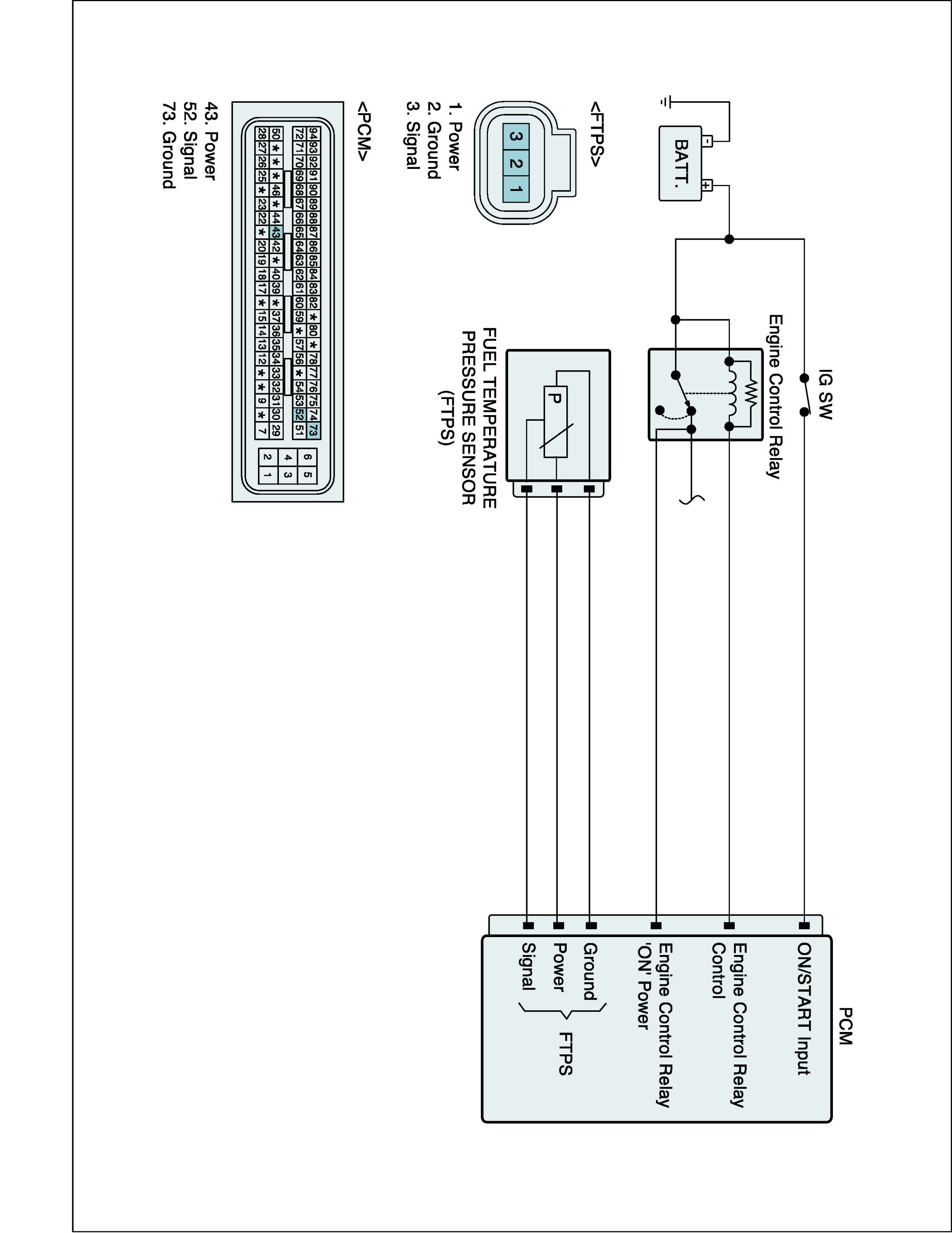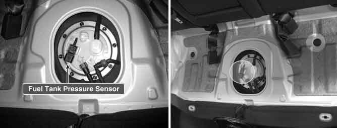 The evaporative emission control system prevents hydrocarbon vapors from escaping from the fuel tank into the atmosphere where they could form photochemical smog. Gasoline vapors are collected in the charcoal canister. The Fuel Tank Pressure Sensor (FTPS) is an integral part of the evaporative monitoring system. The PCM monitors the FTPS signal to detect vacuum decay and excess vacuum. The FTPS measures the difference between the air pressure inside the fuel tank and outside air pressure to check the purge control solenoid valve operation and for leak detection in the evaporative emission control system by monitoring pressure and vacuum levels in the fuel tank during the purge control solenoid valve operating cycles.