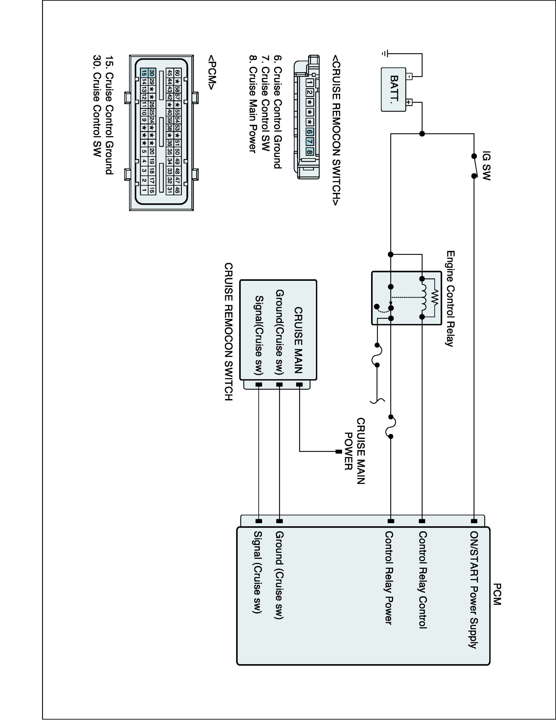 The cruise control system keeps the vehicle running at a fixed speed until a signal canceling this fixed speed is received. When the main switch is turned on with vehicle in the running mode, the battery voltage is applied to the ECM. When a signal from the control switch is input to the ECM while the vehicle is in state, the ECM controls fuel injection to make a car go at a steady speed you want. Also, while the system is operating, "CRUISE" indicator lamp in the meter assembly lights up.