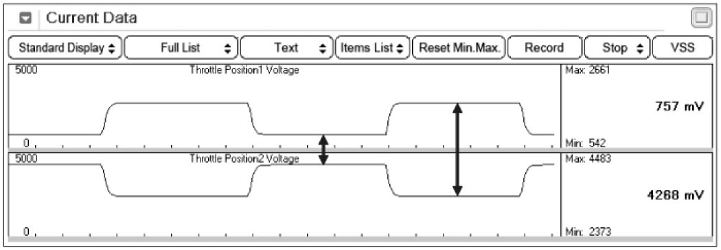 > During 'ETC Motor' test, TPS1 and TPS2 show symmetrical movements.
