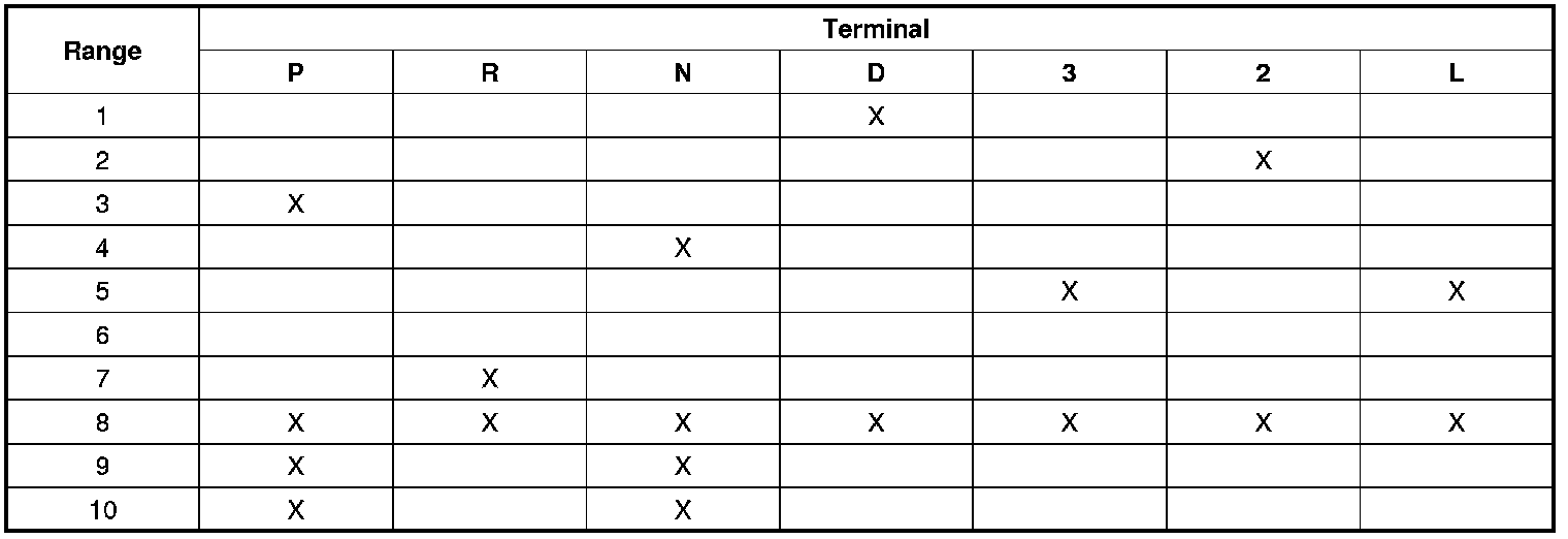 [ RANGE SWITCH continuity check table (Case of SPORTS MODE vehicle has no 3,2,L range) ]