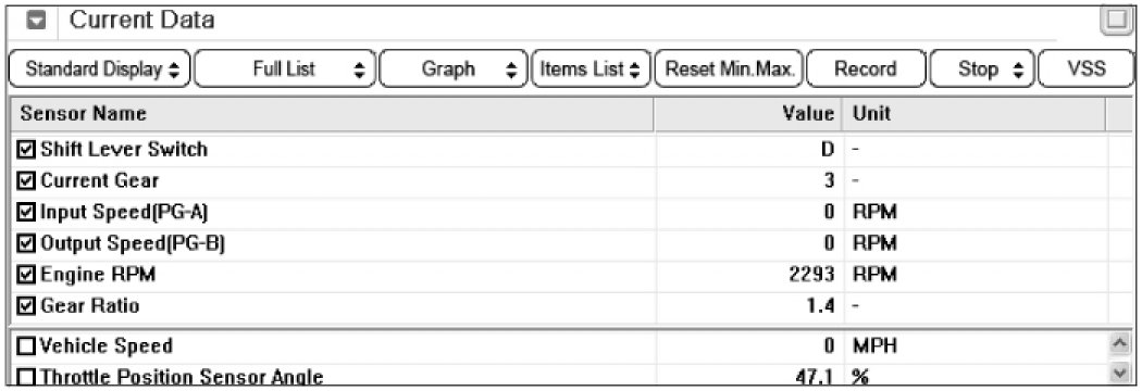 3. Monitor the "ENGINE SPEED, INPUT SPEED SENSOR, OUTPUT SPEED SENSOR, GEAR POSITION" parameter on the scantool.