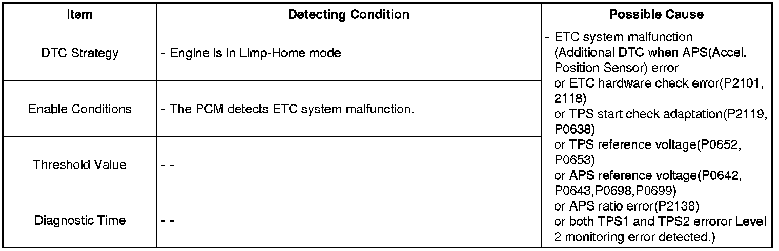 If a malfunction occurs in the Electronic Throttle Control (ETC) system, the PCM will control the engine from predetermined data stored in its memory or stop the engine if a safety problem is anticipated, as an Emergency Operation (Limp-Home)mode. The purpose of Limp-Home mode is to control the engine as close as possible to normal engine operation if a malfunction occurs. When the DTC related to ETC system is recorded by the PCM, then this DTC will be set. This DTC only indicates malfunction related to ETC system has occurred and engine is in Limp-Home mode. DO ALL REPAIRS associated malfunction with ETC system.