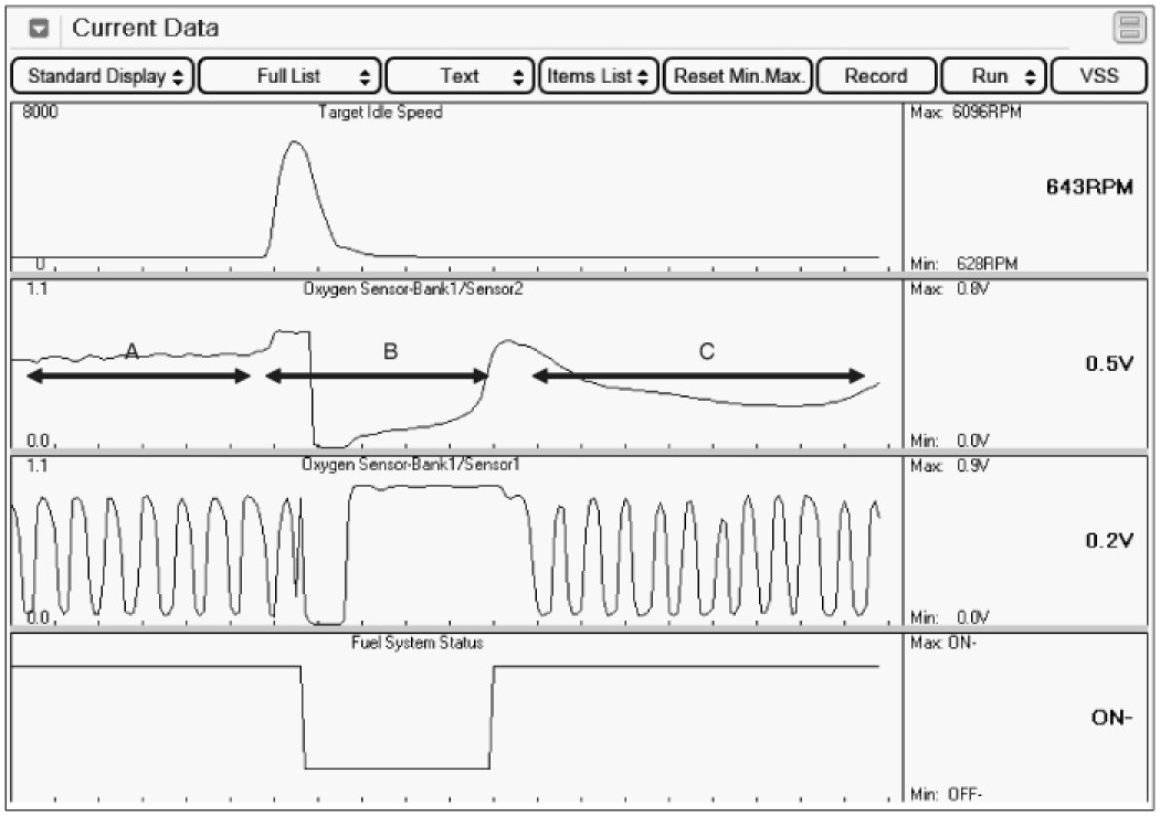 The rear heated oxygen sensor is mounted on the rear side of the Catalytic Converter (warm-up catalytic converter) or in the rear exhaust pipe, which is able to detect catalyst efficiency. The rear heated oxygen sensor (HO2S) produces a voltage between 0 V and 1 V. This rear heated oxygen sensor is used to estimate the oxygen storage capability. If a catalyst has good conversion properties, the oxygen fluctuations are smoothed by the oxygen storage capacity of the catalyst. If the conversion provided by the catalyst is low due to aging, poisoning or misfiring, then the oxygen fluctuations are similar to signals from the front oxygen sensor.